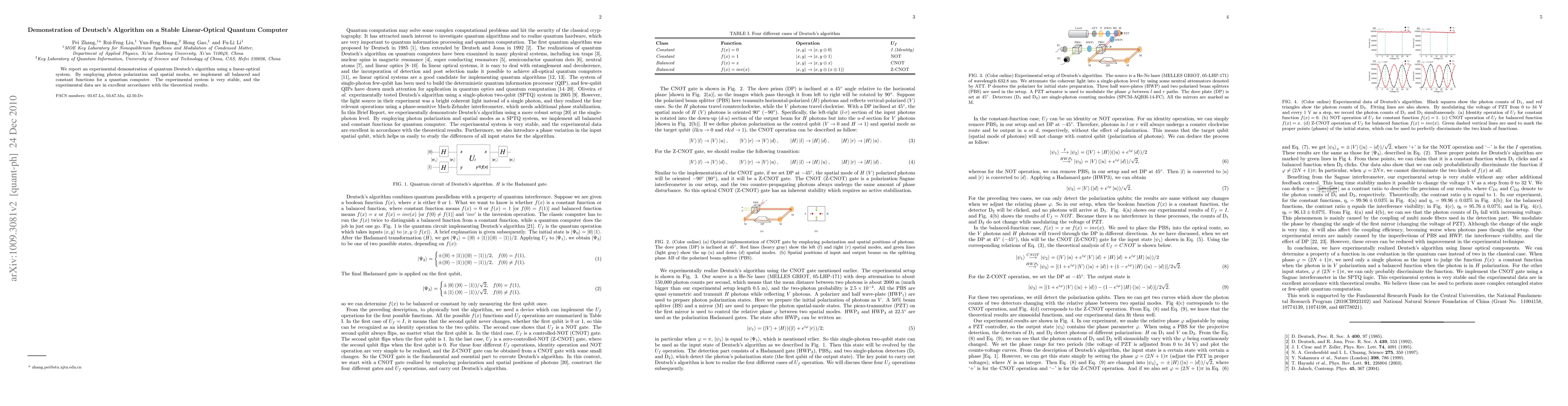 The research demonstrates Deutsch's algorithm using a stable linear-optical quantum computer, implementing all balanced and constant functions for a quantum computer through photon polarization and spatial modes.