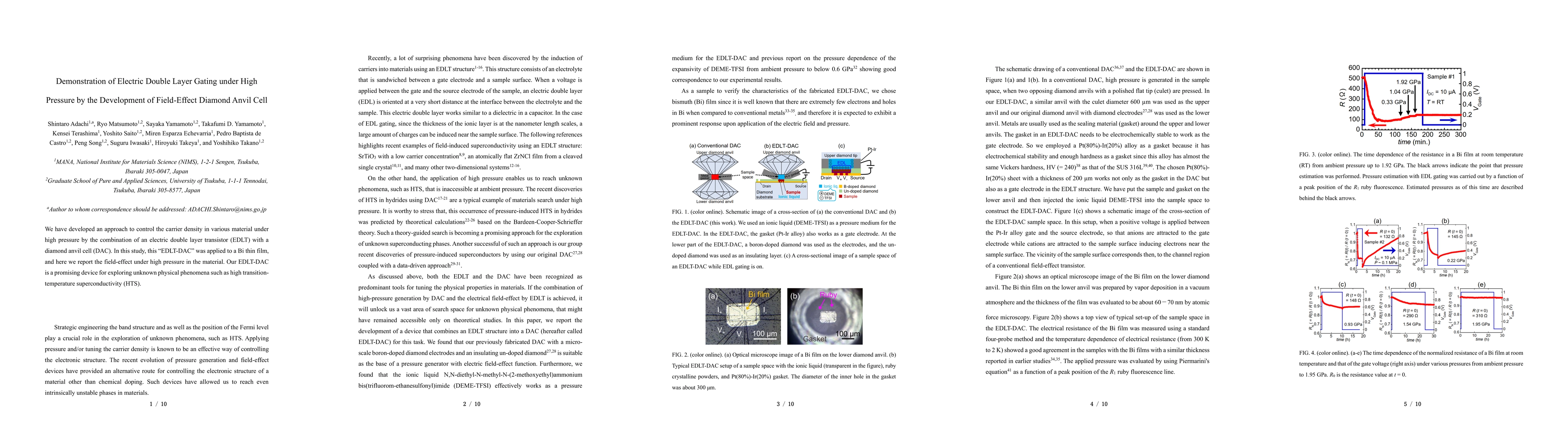 This study demonstrates the control of carrier density in materials under high pressure using an electric double layer transistor combined with a diamond anvil cell, specifically applied to a Bi thin film. The developed field-effect diamond anvil cell (EDLT-DAC) shows potential for exploring phenomena like high transition-temperature superconductivity.