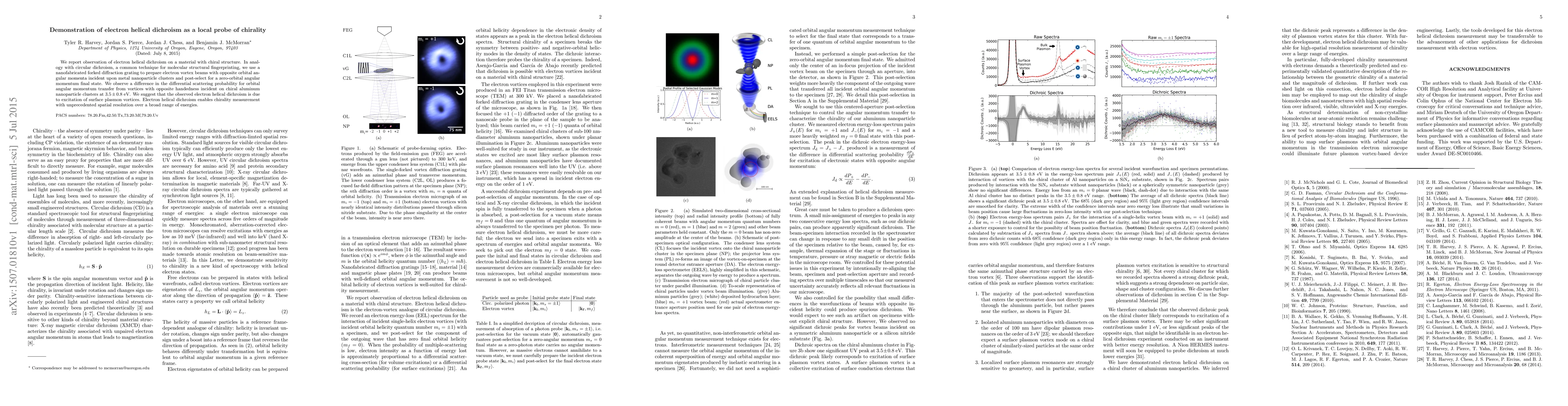 This research demonstrates electron helical dichroism, a technique analogous to circular dichroism, to probe chirality in materials using electron vortex beams. The study reveals a difference in scattering probability for chiral aluminum nanoparticles, suggesting the phenomenon is caused by excitation of surface plasmon vortices, offering high-resolution chirality measurement.