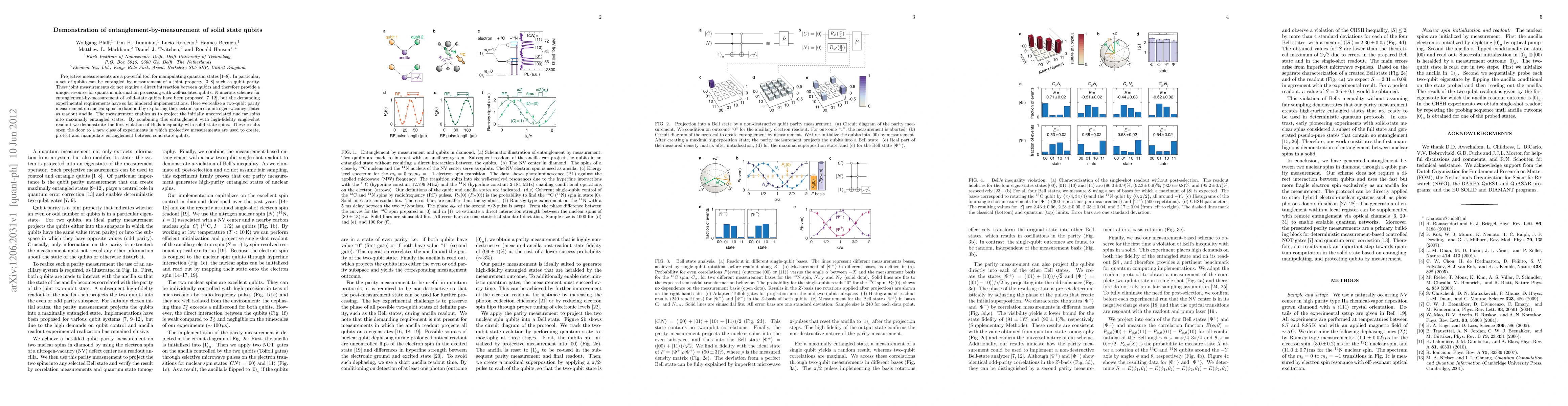 This research demonstrates the entanglement of solid-state qubits via projective measurements using nuclear spins in diamond, mediated by a nitrogen-vacancy center's electron spin, achieving the first violation of Bell's inequality with solid-state spins. This method provides a novel approach for quantum information processing with isolated qubits.