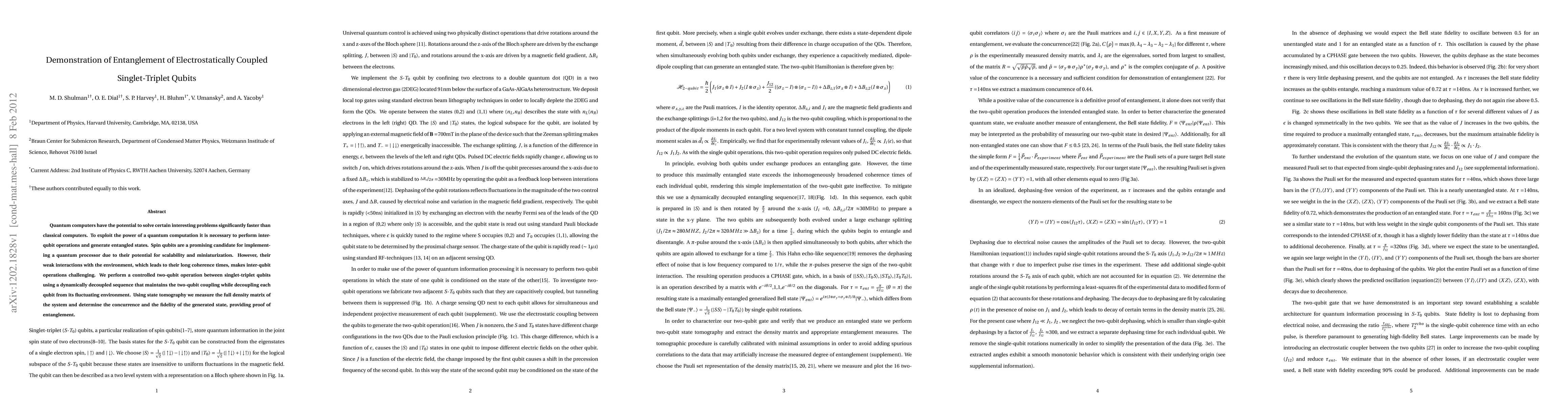 This paper demonstrates a controlled two-qubit operation between singlet-triplet spin qubits using a dynamically decoupled sequence, achieving entanglement and measuring the full density matrix to determine concurrence and fidelity, thus proving the generation of entangled states.