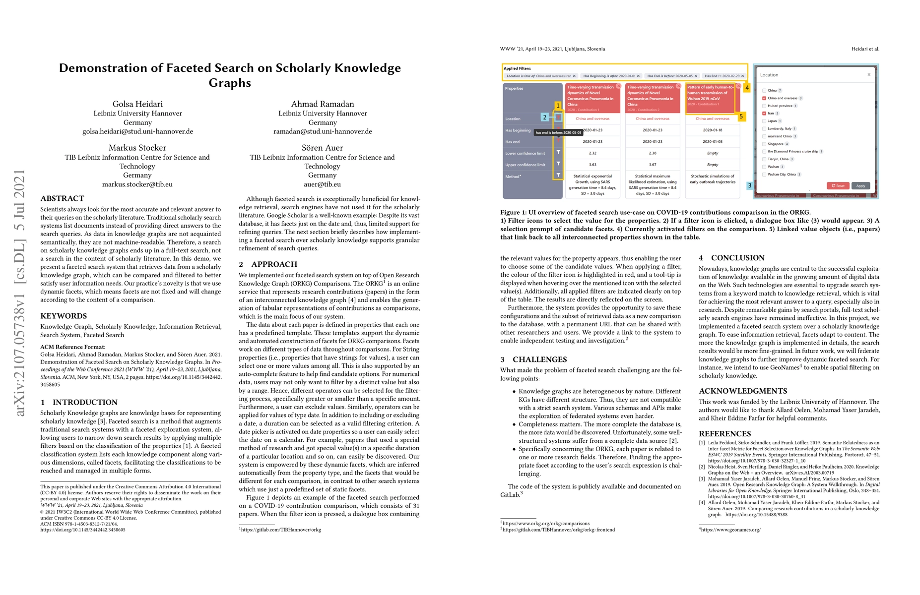 This paper demonstrates a faceted search system for scholarly knowledge graphs, enabling users to filter and compare data dynamically. Unlike traditional search systems, this approach aims to provide direct answers to queries by leveraging machine-readable content.