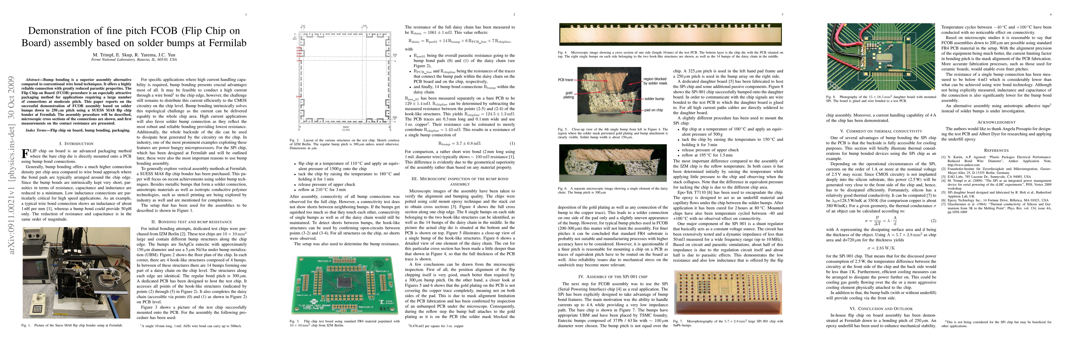 This paper demonstrates the successful assembly of fine pitch FCOB using solder bumps down to 250um pitch at Fermilab, showcasing a highly reliable and low-parasitic connection method compared to wire bonding. Initial measurements of contact resistance are also presented.
