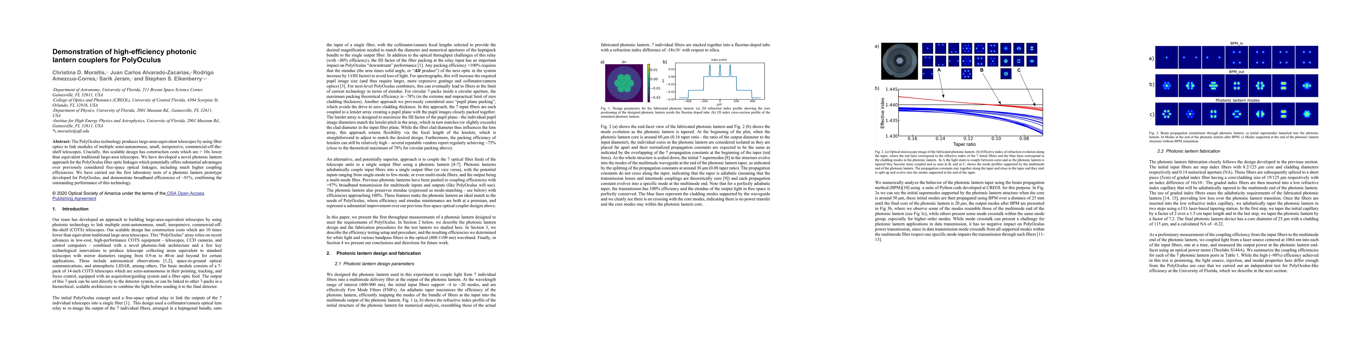Researchers developed a high-efficiency photonic lantern coupler for PolyOculus, achieving broadband efficiencies of ~91% in laboratory tests, offering substantial advantages over free-space optical linkages.