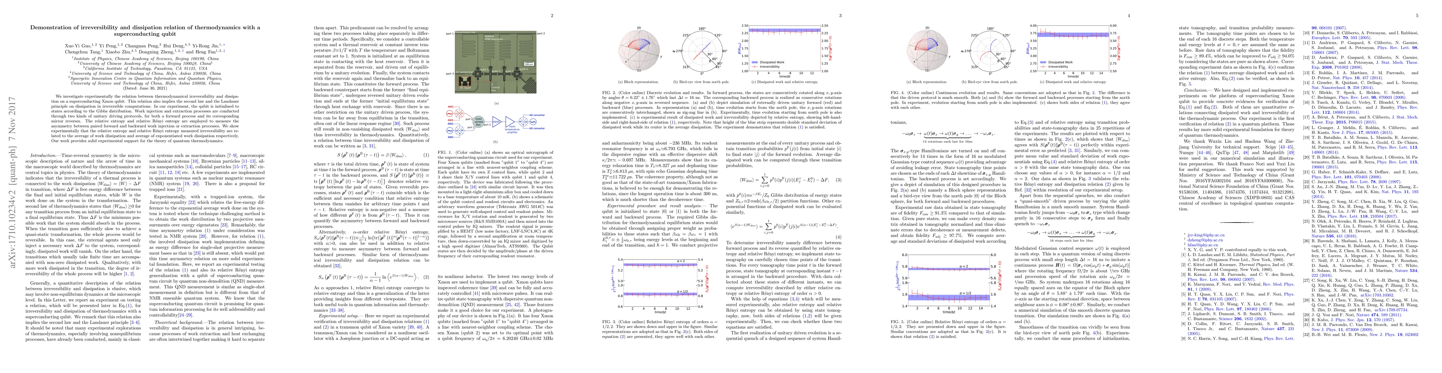 This paper experimentally investigates the thermodynamic irreversibility and dissipation relation in a superconducting qubit, demonstrating the second law and Landauer principle. It uses relative entropy and Re'nyi entropy to measure the asymmetry between forward and backward work processes, showing a direct link between measured irreversibility and work dissipation.