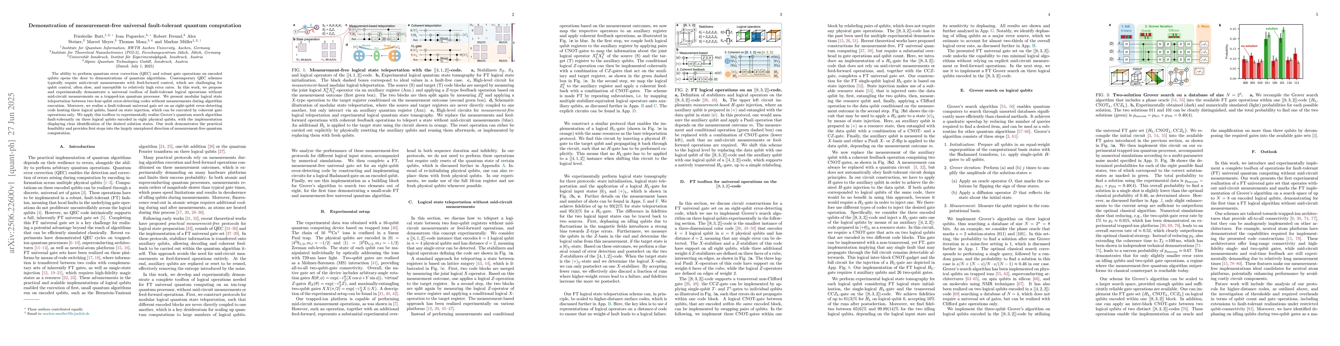 The ability to perform quantum error correction (QEC) and robust gate operations on encoded qubits opens the door to demonstrations of quantum algorithms. Contemporary QEC schemes typically require mid-circuit measurements with feed-forward control, which are challenging for qubit control, often slow, and susceptible to relatively high error rates. In this work, we propose and experimentally demonstrate a universal toolbox of fault-tolerant logical operations without mid-circuit measurements on a trapped-ion quantum processor. We present modular logical state teleportation between two four-qubit error-detecting codes without measurements during algorithm execution. Moreover, we realize a fault-tolerant universal gate set on an eight-qubit error-detecting code hosting three logical qubits, based on state injection, which can be executed by coherent gate operations only. We apply this toolbox to experimentally realize Grover's quantum search algorithm fault-tolerantly on three logical qubits encoded in eight physical qubits, with the implementation displaying clear identification of the desired solution states. Our work demonstrates the practical feasibility and provides first steps into the largely unexplored direction of measurement-free quantum computation.