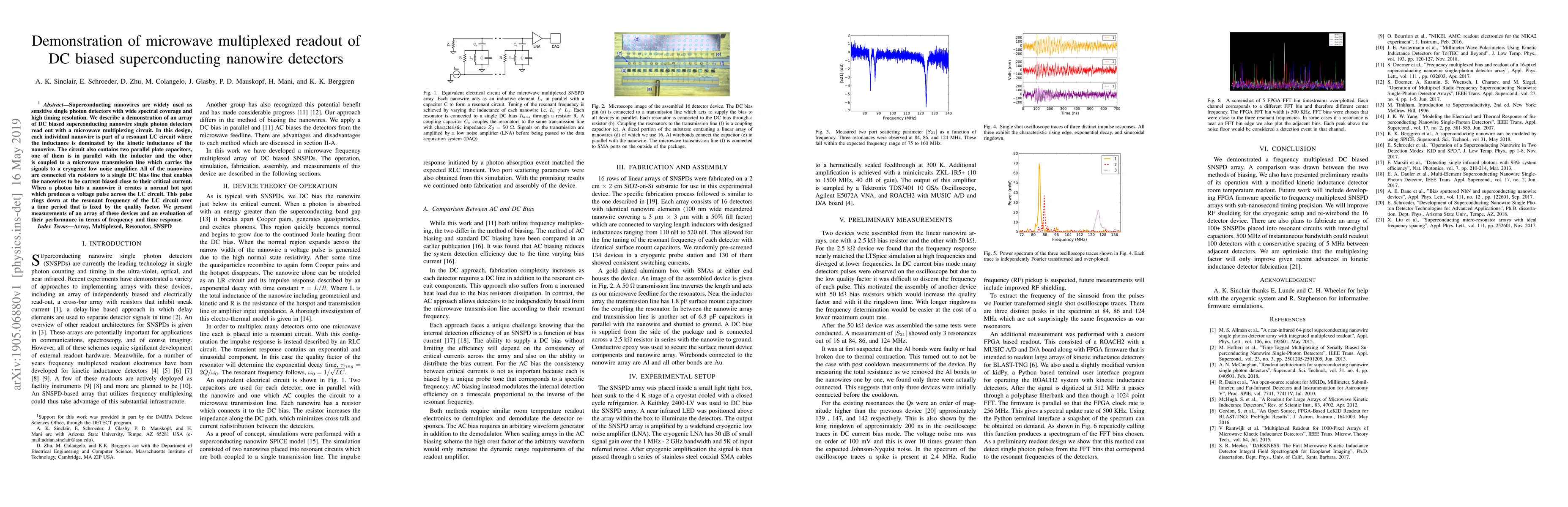 This paper demonstrates an array of DC biased superconducting nanowire single photon detectors read out via a microwave multiplexing circuit, showing high-frequency and time response performance. The design uses resonant LC circuits with kinetic inductance from nanowires and parallel capacitors to transmit signals to a cryogenic amplifier.
