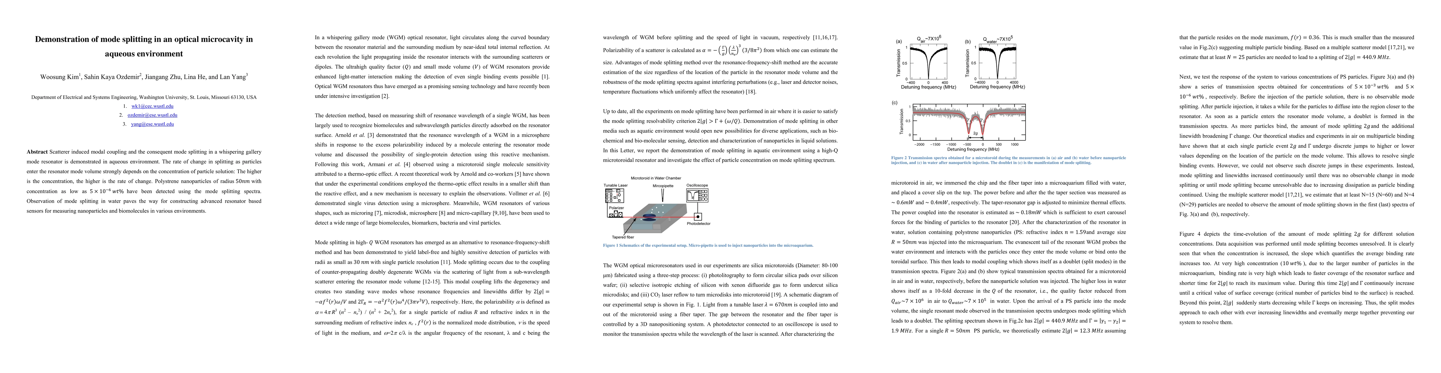 This study demonstrates scatterer-induced modal coupling and mode splitting in a whispering gallery mode resonator immersed in an aqueous environment, showing that higher particle concentrations lead to a faster rate of mode splitting. The detection of polystyrene nanoparticles at concentrations as low as 5x10^(-6)wt% indicates potential for advanced sensor development for measuring nanoparticles and biomolecules.