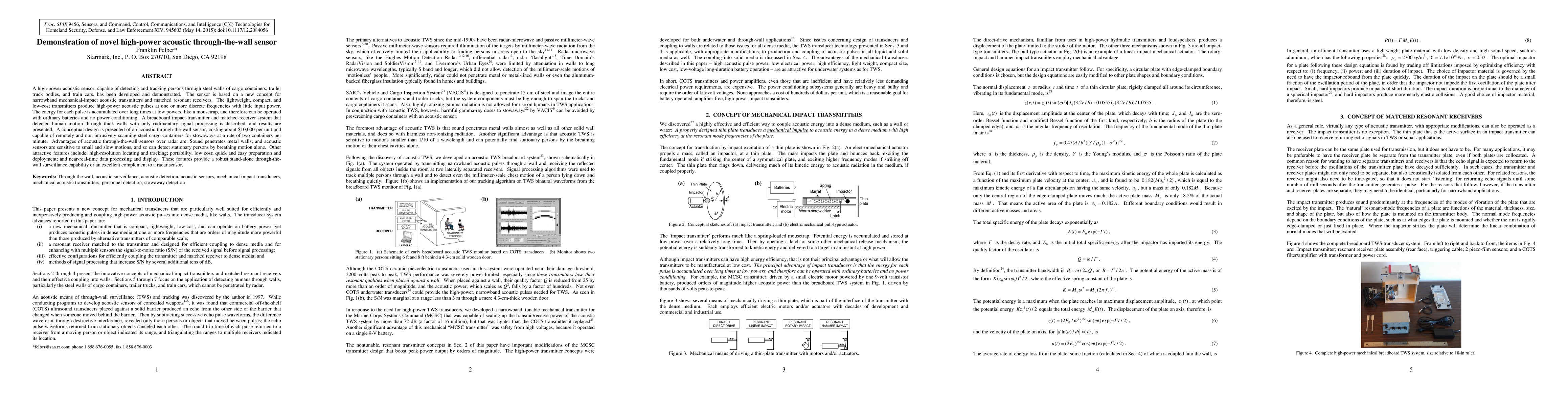 A high-power acoustic sensor, capable of detecting and tracking persons through steel walls of cargo containers, trailer truck bodies, and train cars, has been developed and demonstrated. The sensor is based on a new concept for narrowband mechanical-impact acoustic transmitters and matched resonant receivers. The lightweight, compact, and low-cost transmitters produce high-power acoustic pulses at one or more discrete frequencies with little input power. The energy for each pulse is accumulated over long times at low powers, like a mousetrap, and therefore can be operated with ordinary batteries and no power conditioning. A breadboard impact-transmitter and matched-receiver system that detected human motion through thick walls with only rudimentary signal processing is described, and results are presented. A conceptual design is presented of an acoustic through-the-wall sensor, costing about $10,000 per unit and capable of remotely and non-intrusively scanning steel cargo containers for stowaways at a rate of two containers per minute. Advantages of acoustic through-the-wall sensors over radar are: Sound penetrates metal walls; and acoustic sensors are sensitive to small and slow motions, and so can detect stationary persons by breathing motion alone. Other attractive features include: high-resolution locating and tracking; portability; low cost; quick and easy preparation and deployment; and near-real-time data processing and display. These features provide a robust stand-alone through-the-wall surveillance capability or an excellent complement to a radar sensor.