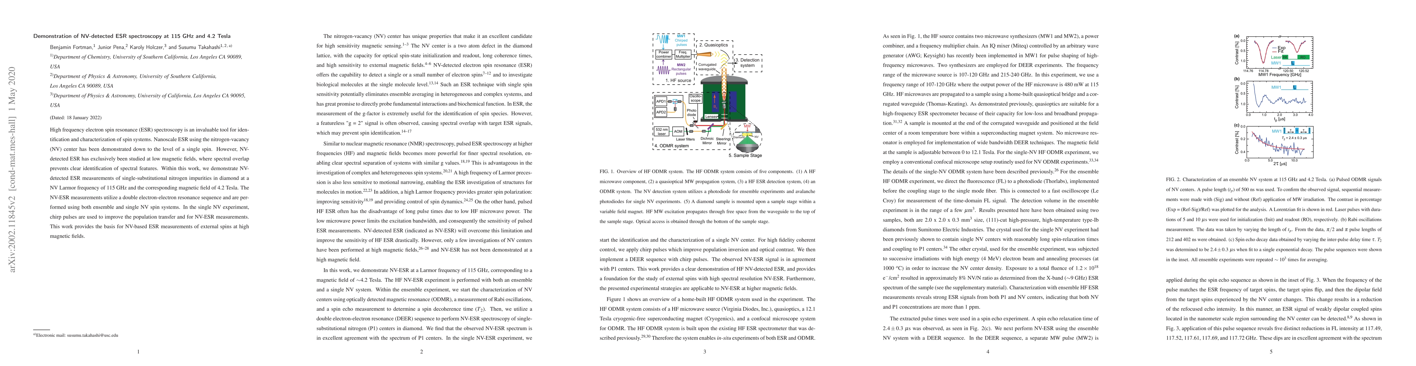 This paper demonstrates NV-detected ESR spectroscopy at 115 GHz and 4.2 Tesla, utilizing chirp pulses and double electron-electron resonance to improve single-spin measurements and overcome spectral overlap issues at high magnetic fields.