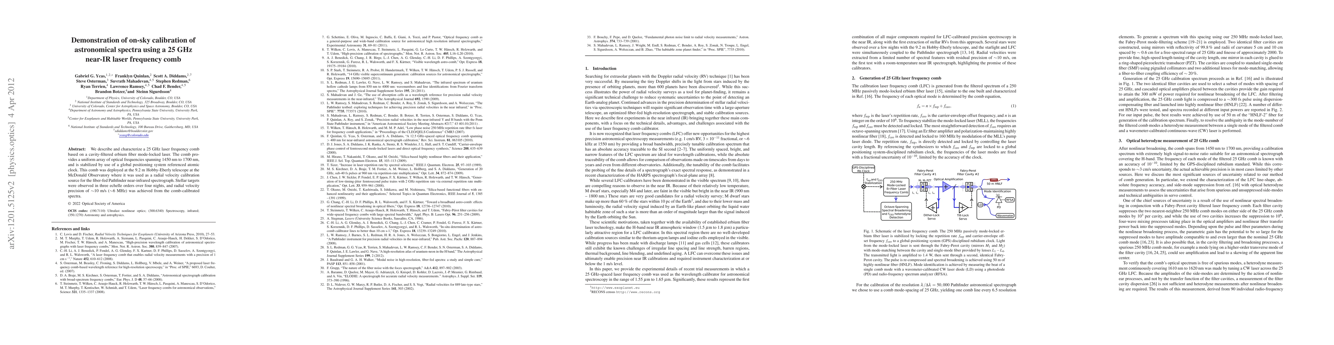 This paper demonstrates the on-sky calibration of astronomical spectra using a 25 GHz near-IR laser frequency comb, achieving radial velocity precision of ~10 m/s at the Hobby-Eberly telescope. The frequency comb, stabilized by a GPS-referenced atomic clock, provided a uniform array of optical frequencies for calibrating the Pathfinder spectrograph.