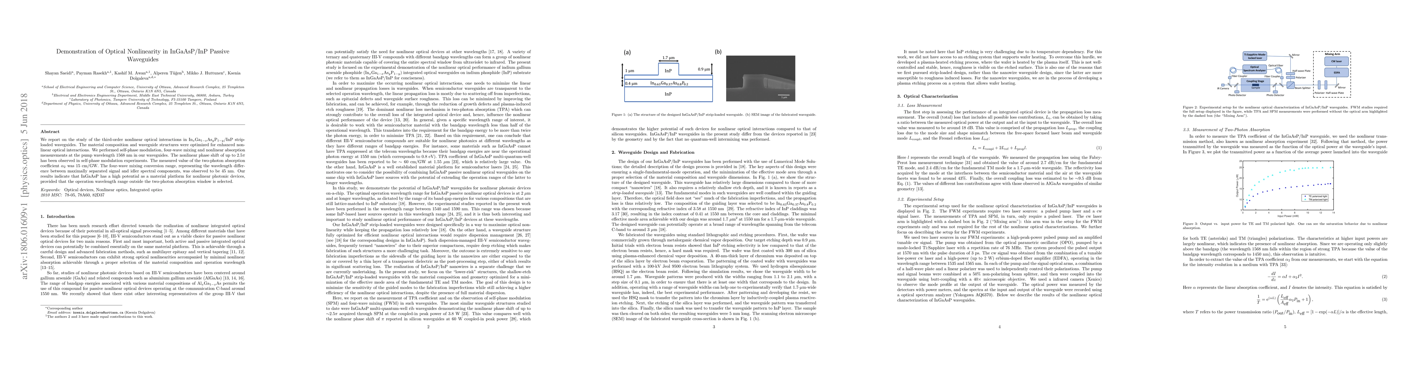 The study demonstrates significant third-order nonlinear optical interactions in InGaAsP/InP waveguides, achieving a nonlinear phase shift of up to $2.5pi$ in self-phase modulation. The two-photon absorption coefficient was measured as 15 cm/GW, and a four-wave mixing conversion range of 45 nm was observed. These findings suggest InGaAsP's potential for nonlinear photonic devices, especially when operating outside the two-photon absorption window.