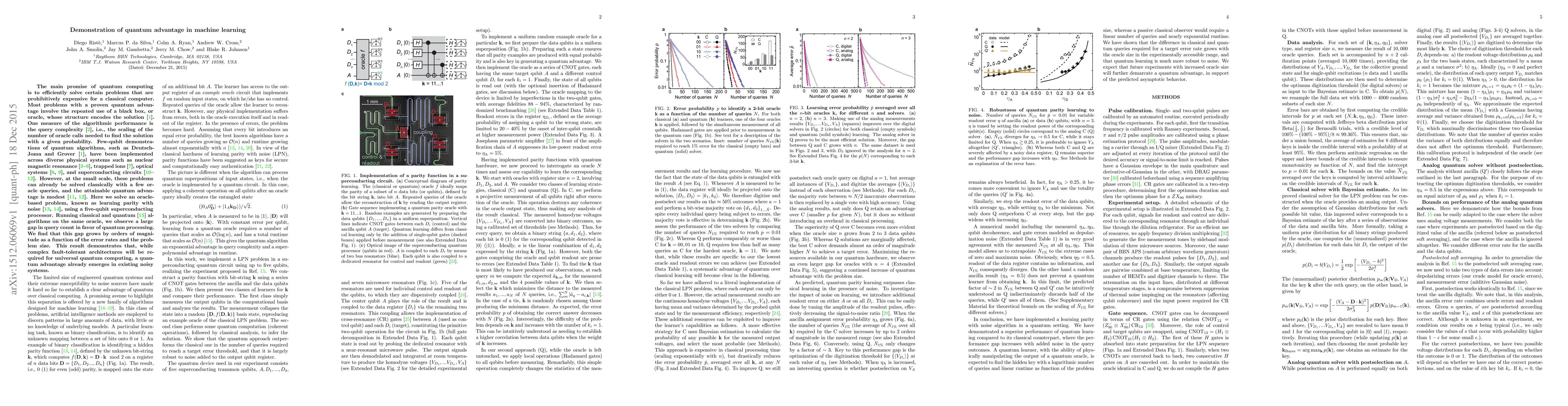 This paper demonstrates a significant quantum advantage in solving the learning parity with noise problem using a five-qubit superconducting processor, showing a large gap in query count compared to classical algorithms, especially as error rates and problem size increase. This indicates that quantum computing can outperform classical methods even in current noisy systems.