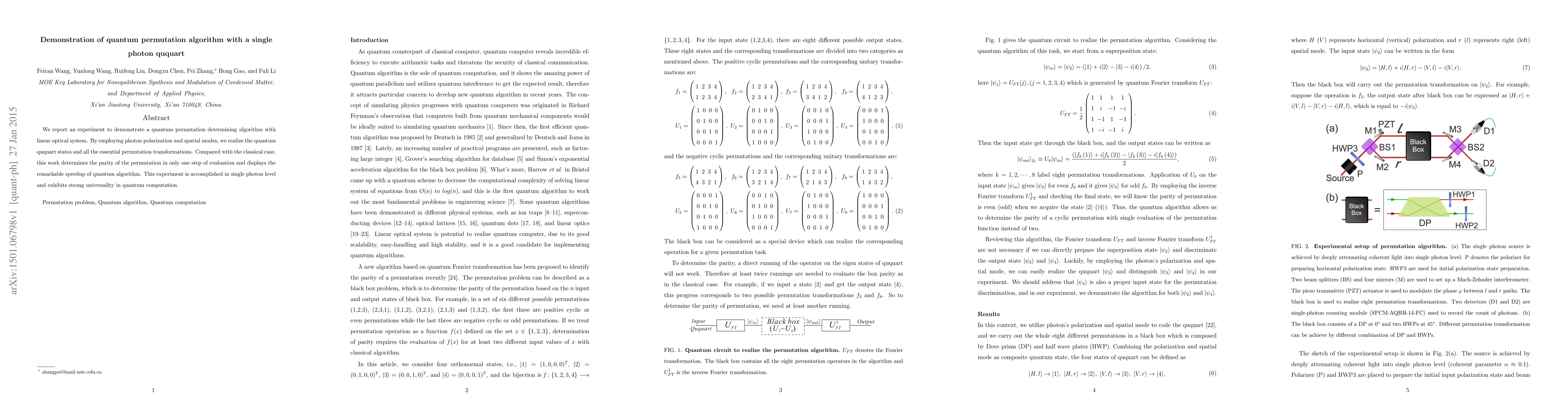 This research demonstrates a quantum permutation algorithm using a single photon ququart in a linear optical system, achieving parity determination in one step and showcasing quantum speedup compared to classical methods. The experiment highlights the potential of single-photon quantum computation.