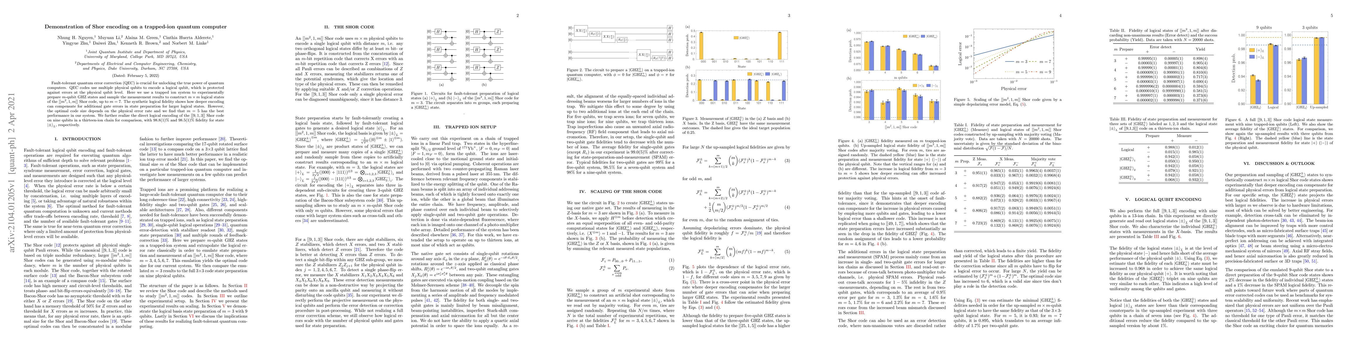 Fault-tolerant quantum error correction (QEC) is crucial for unlocking the true power of quantum computers. QEC codes use multiple physical qubits to encode a logical qubit, which is protected against errors at the physical qubit level. Here we use a trapped ion system to experimentally prepare $m$-qubit GHZ states and sample the measurement results to construct $m\times m$ logical states of the $[[m^2,1,m]]$ Shor code, up to $m=7$. The synthetic logical fidelity shows how deeper encoding can compensate for additional gate errors in state preparation for larger logical states. However, the optimal code size depends on the physical error rate and we find that $m=5$ has the best performance in our system. We further realize the direct logical encoding of the $[[9,1,3]]$ Shor code on nine qubits in a thirteen-ion chain for comparison, with $98.8(1)\%$ and $98.5(1)\%$ fidelity for state $\left\vert\pm\right\rangle_L$, respectively.