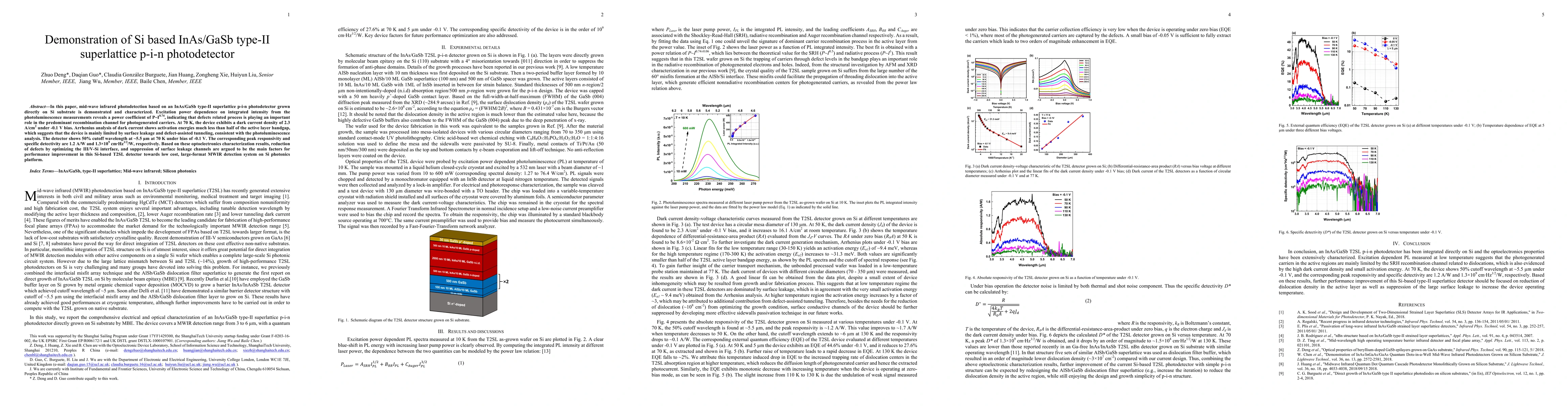 This paper demonstrates a Si-based InAs/GaSb type-II superlattice p-i-n photodetector for mid-wave infrared detection, showing a peak responsivity of 1.2 A/W and specific detectivity of 1.3*10e9 cm*Hz1/2/W at 70 K. The device's performance is limited by surface leakage and defect-assisted tunneling, suggesting optimization of the III/V-Si interface is crucial for future improvements.