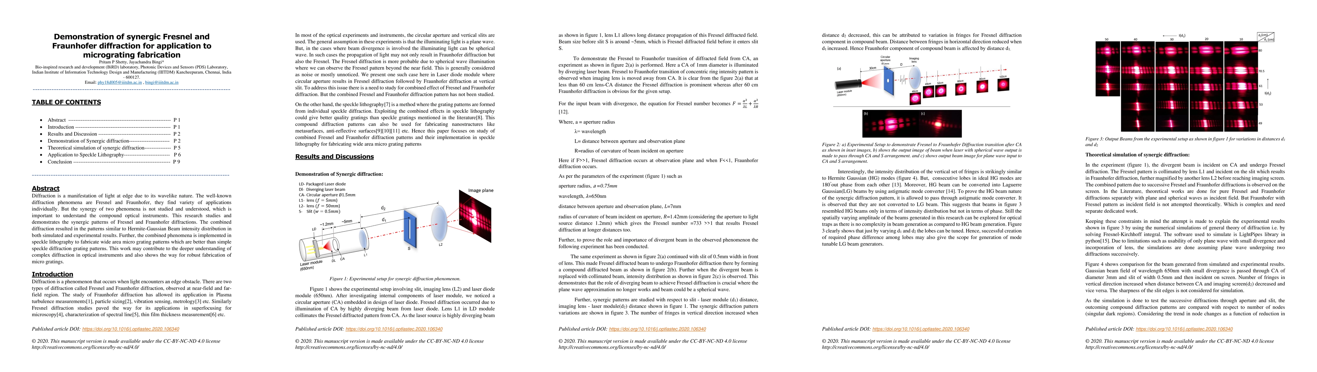 This research demonstrates the synergic effects of Fresnel and Fraunhofer diffraction, revealing combined diffraction patterns akin to Hermite-Gaussian Beam distributions. This approach is applied in speckle lithography to fabricate superior micro grating patterns, enhancing the understanding of complex diffraction in optical instruments.