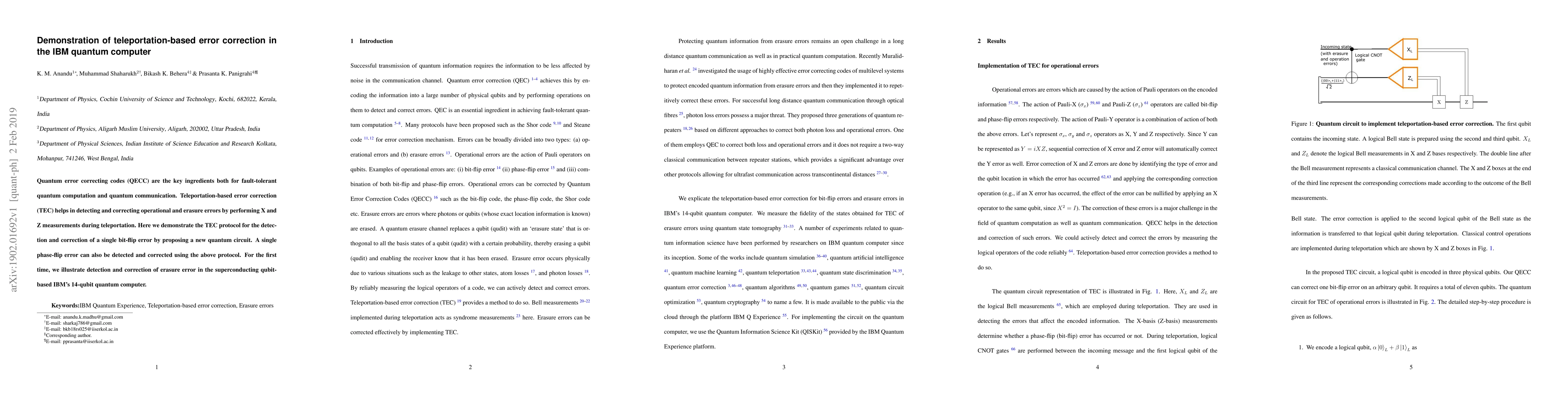 Quantum error correcting codes (QECC) are the key ingredients both for fault-tolerant quantum computation and quantum communication. Teleportation-based error correction (TEC) helps in detecting and correcting operational and erasure errors by performing X and Z measurements during teleportation. Here we demonstrate the TEC protocol for the detection and correction of a single bit-flip error by proposing a new quantum circuit. A single phase-flip error can also be detected and corrected using the above protocol. For the first time, we illustrate detection and correction of erasure error in the superconducting qubit-based IBM's 14-qubit quantum computer.