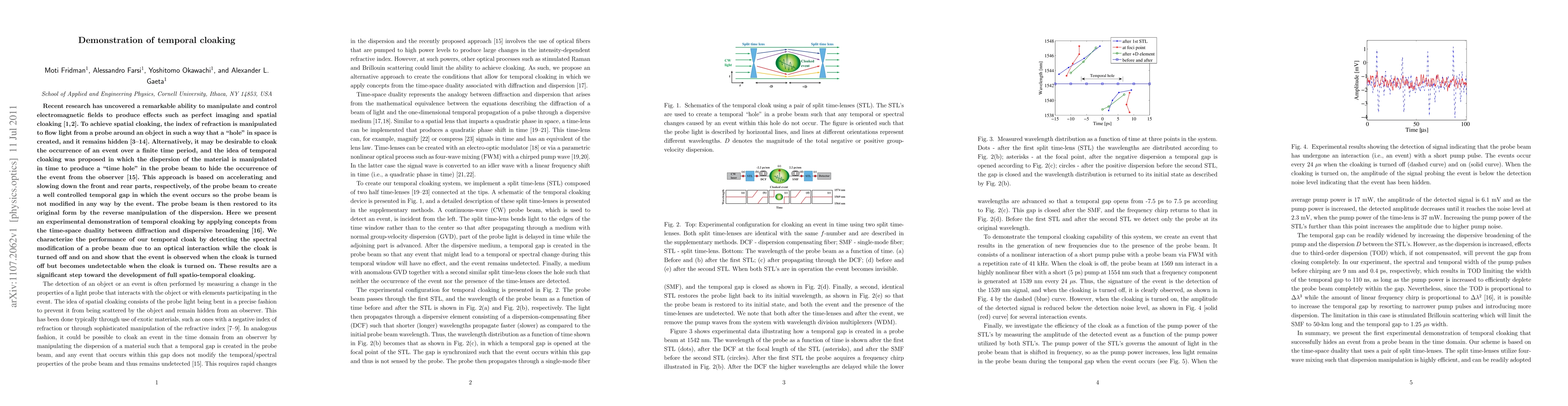 This paper demonstrates the first experimental realization of temporal cloaking, where the occurrence of an event is hidden from observation over a specific time period by manipulating the dispersion of a probe beam to create a "time hole." The study confirms that events are undetectable when the cloak is active, marking a significant advancement towards spatio-temporal cloaking.