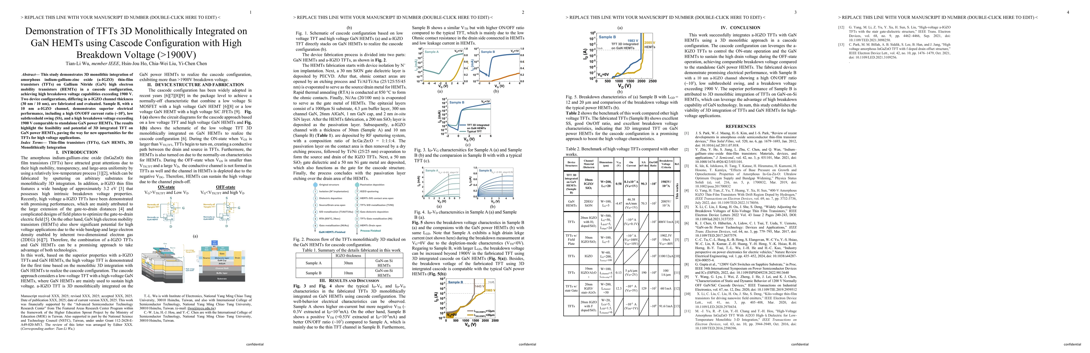 This study demonstrates 3D monolithic integration of amorphous indium-gallium-zinc oxide (a-IGZO) thin-film transistors (TFTs) on Gallium Nitride (GaN) high electron mobility transistors (HEMTs) in a cascode configuration, achieving high breakdown voltage capabilities exceeding 1900 V. Two device configurations, differing in a-IGZO channel thickness (30 nm / 10 nm), are fabricated and evaluated. Sample B, with a 10 nm a-IGZO channel, demonstrates superior electrical performance, including a high ON/OFF current ratio (~10^7), low subthreshold swing (SS), and a high breakdown voltage exceeding 1900 V comparable to standalone GaN power HEMTs. The results highlight the feasibility and potential of 3D integrated TFT on GaN power HEMTs, paving the way for new opportunities for the TFTs for high voltage applications.