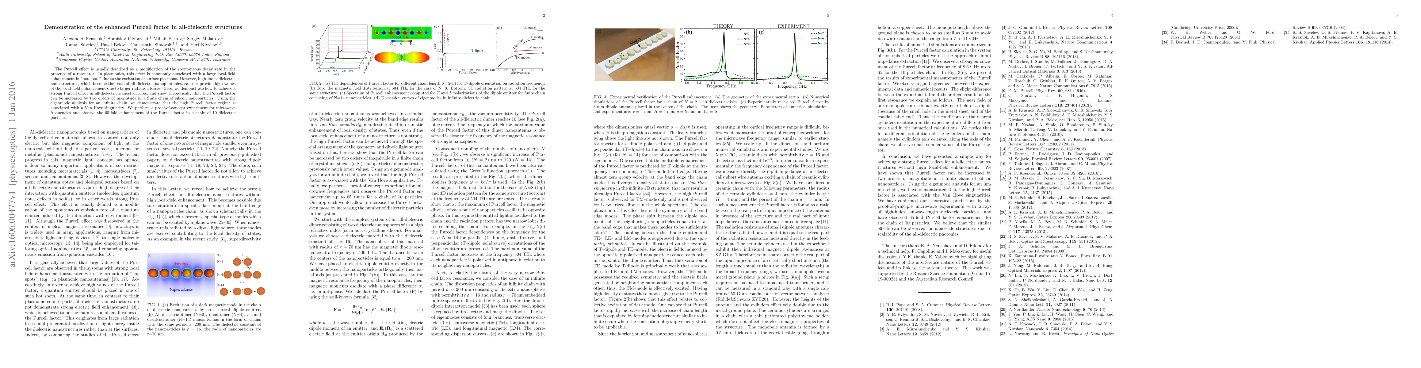 This paper demonstrates the enhancement of the Purcell factor in all-dielectric nanostructures, showing theoretically and experimentally that a finite chain of silicon nanoparticles can achieve a two-order-of-magnitude increase in the Purcell factor due to a Van Hove singularity. Experimental validation at microwave frequencies confirms a 65-fold enhancement.