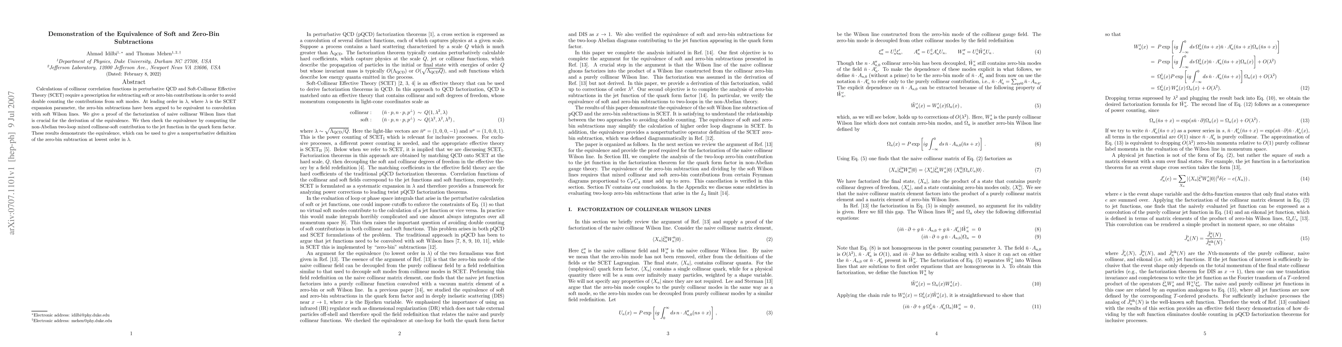 Calculations of collinear correlation functions in perturbative QCD and Soft-Collinear Effective Theory (SCET) require a prescription for subtracting soft or zero-bin contributions in order to avoid double counting the contributions from soft modes. At leading order in $\lambda$, where $\lambda$ is the SCET expansion parameter, the zero-bin subtractions have been argued to be equivalent to convolution with soft Wilson lines. We give a proof of the factorization of naive collinear Wilson lines that is crucial for the derivation of the equivalence. We then check the equivalence by computing the non-Abelian two-loop mixed collinear-soft contribution to the jet function in the quark form factor. These results provide strong support for the equivalence, which can be used to give a nonperturbative definition of the zero-bin subtraction at lowest order in $\lambda$.