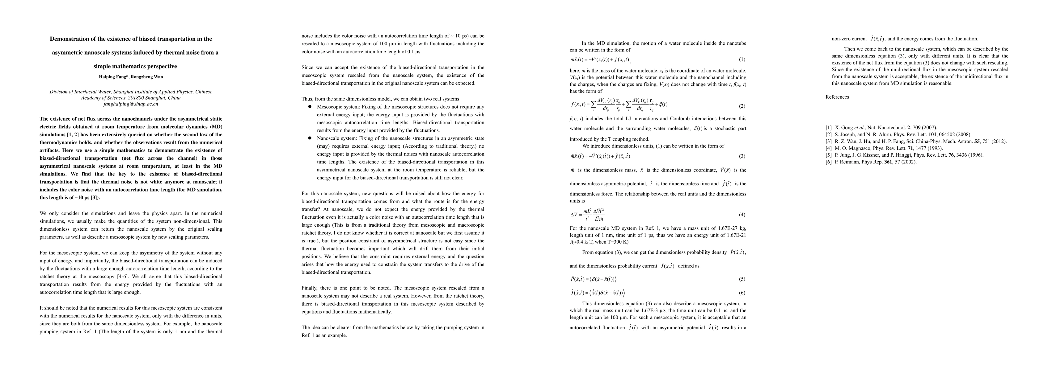 The existence of net flux across the nanochannels under the asymmetrical static electric fields obtained at room temperature from molecular dynamics (MD) simulations [Nat. Nanotechnol. 2, 709 (2007); Phys. Rev. Lett. 101, 064502 (2008)] has been extensively queried on whether the second law of the thermodynamics holds, and whether the observations result from the numerical artifacts. Here we use a simple mathematics to demonstrate the existence of biased-directional transportation (net flux across the channel) in those asymmetrical nanoscale systems at room temperature, at least in the MD simulations. We find that the key to the existence of biased-directional transportation is that the thermal noise is not white anymore at nanoscale; it includes the color noise with an autocorrelation time length (for MD simulation, this length is of ~10 ps).