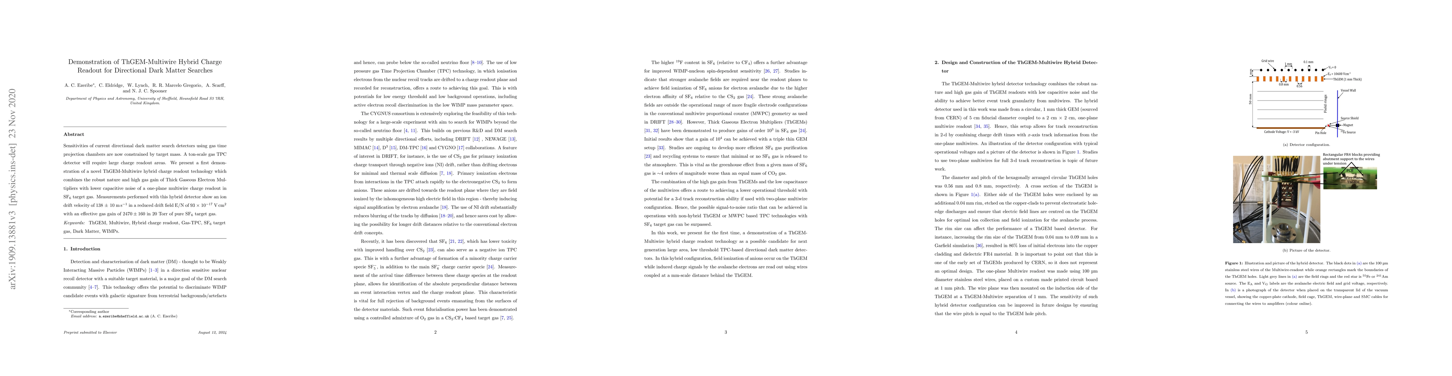This paper demonstrates a novel ThGEM-Multiwire hybrid charge readout technology for directional dark matter searches, combining the high gas gain of ThGEMs with the low noise of a multiwire readout in SF$_6$ gas, achieving an ion drift velocity of $139~\pm~12~\text{ms}^{-1}$ and a gas gain of $2470\pm160$.