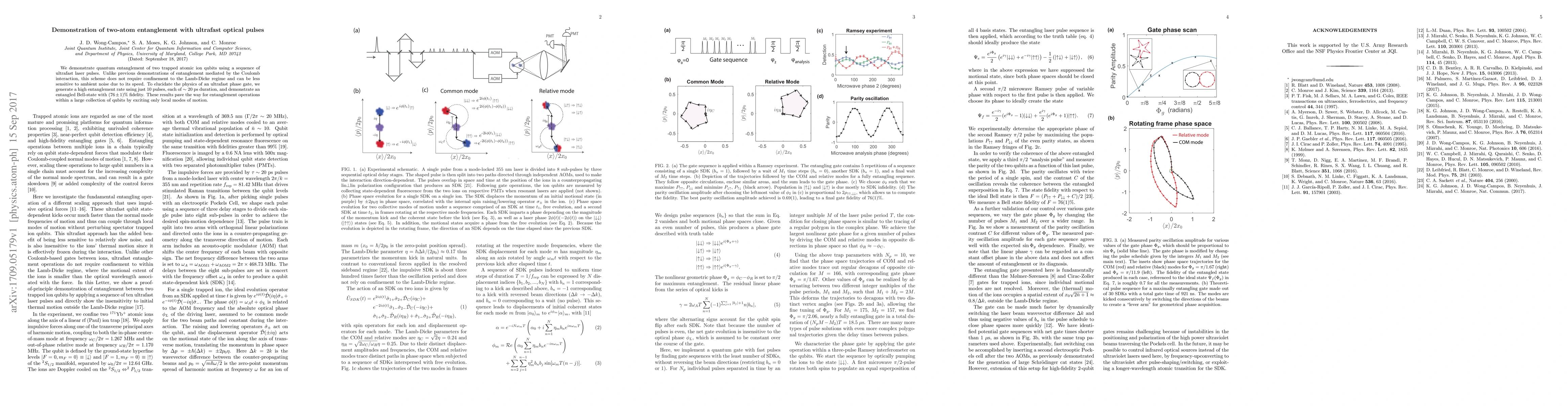 This paper demonstrates quantum entanglement of two trapped atomic ion qubits using ultrafast laser pulses, achieving high entanglement fidelity without the need for the Lamb-Dicke regime, thus potentially reducing sensitivity to ambient noise. The study shows an entangled Bell-state with 76% fidelity using just 10 pulses, each around 20 ps long.