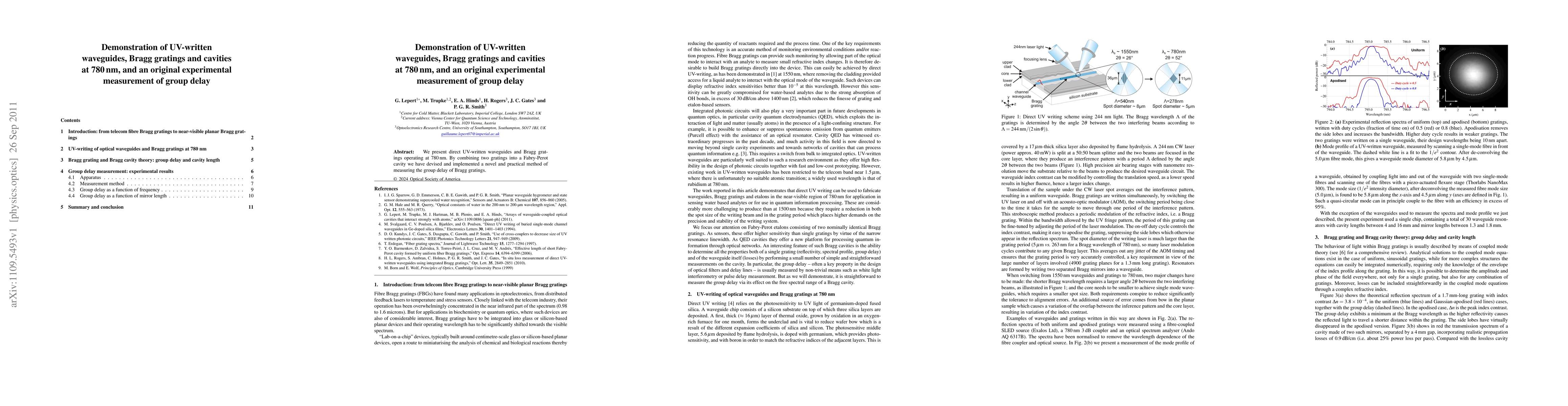 Summary: This paper demonstrates UV-written waveguides, Bragg gratings, and cavities at 780 nm, and introduces an innovative experimental method for measuring the group delay of Bragg gratings using a Fabry-Perot cavity configuration.