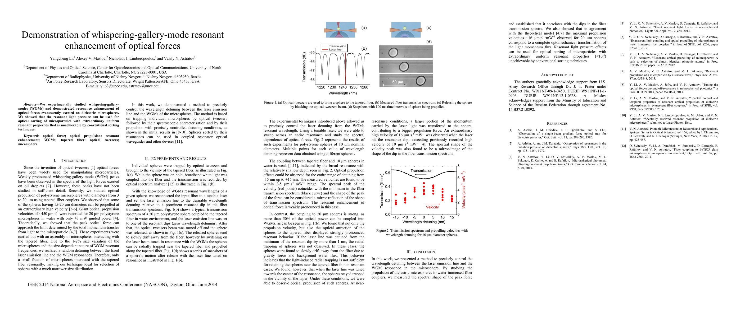 We experimentally studied whispering-gallery modes(WGMs) and demonstrated resonance enhancement of optical forces evanescently exerted on dielectric microspheres. We showed that the resonant light pressure can be used for optical sorting of microparticles with extraordinary uniform resonant properties that is unachievable by conventional sorting techniques.
