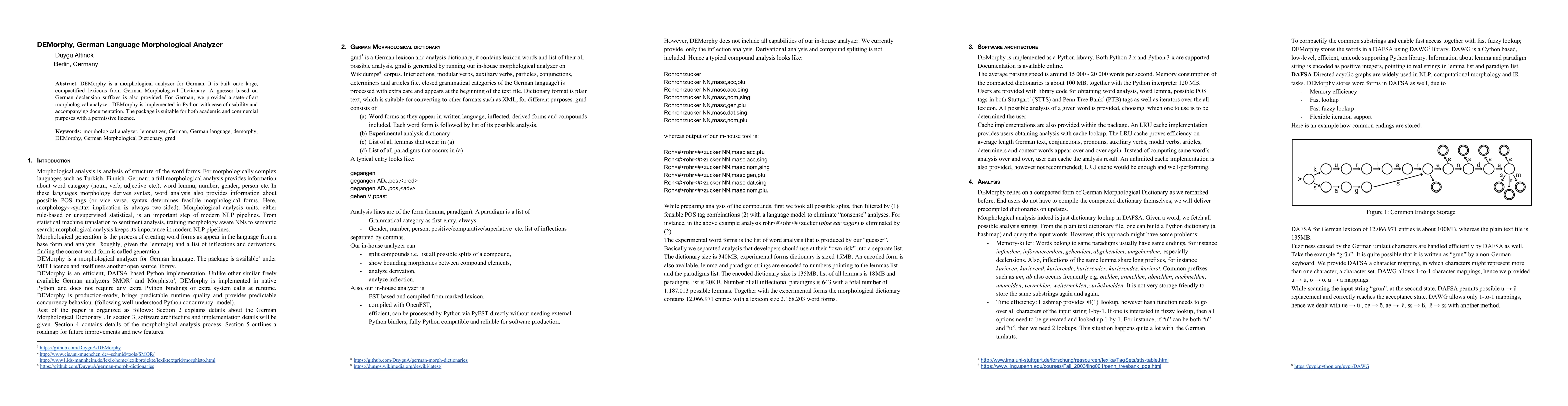 DEMorphy is a sophisticated morphological analyzer for the German language, built on extensive lexicons and a suffix-based guesser for declension. Implemented in Python, it offers ease of use and is available under a permissive license for both academic and commercial applications.