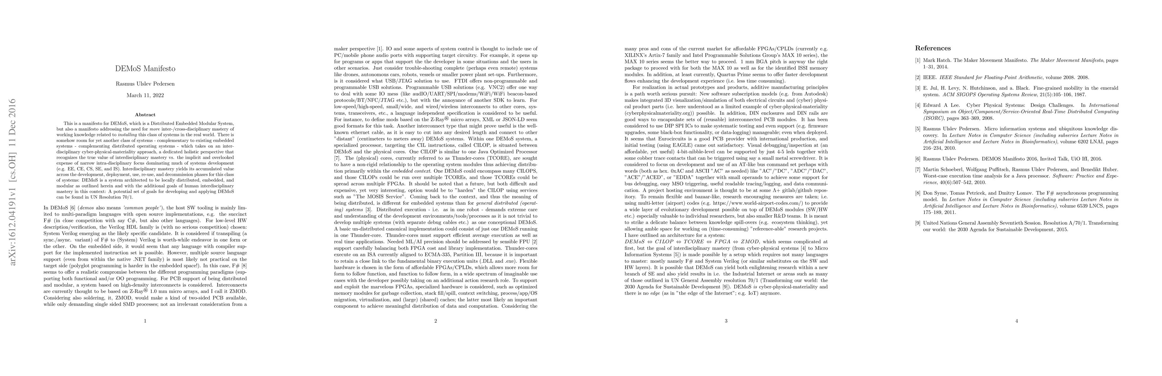 This is a manifesto for DEMoS, which is a Distributed Embedded Modular System, but also a manifesto addressing the need for more inter-/cross-disciplinary mastery of working knowledge related to installing this class of systems in the real world. There is somehow room for yet another class of systems - complementary to existing embedded systems - complementing distributed operating systems - which takes on an interdisciplinary cyber-physical-materiality approach, a dedicated holistic perspective that recognizes the true value of interdisciplinary mastery vs. the implicit and overlooked expense of narrow intra-disciplinary focus dominating much of systems development (e.g. EE, CE, CS, SE, and IS). Interdisciplinary mastery yields its accumulated value across the development, deployment, use, re-use, and decommission phases for this class of systems: DEMoS is a system architected to be locally distributed, embedded, and modular as outlined herein and with the additional goals of human interdisciplinary mastery in this context: A potential set of goals for developing and applying DEMoS can be found in UN Resolution 70/1.