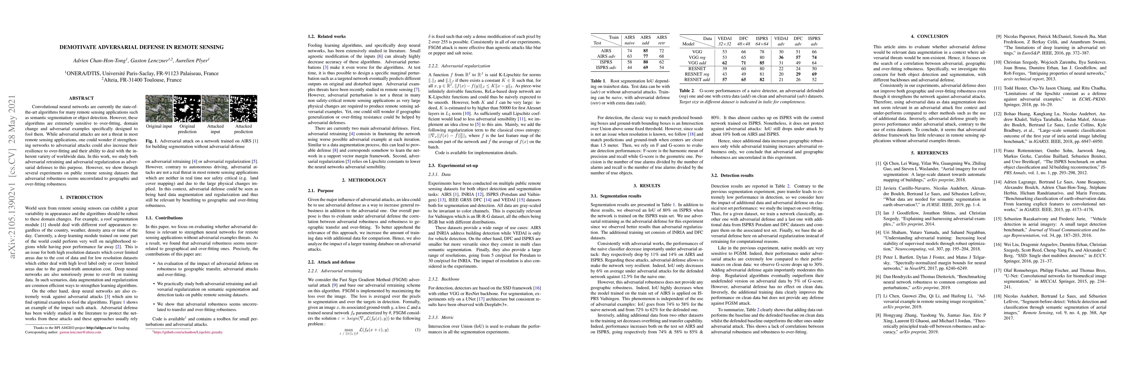 Convolutional neural networks are currently the state-of-the-art algorithms for many remote sensing applications such as semantic segmentation or object detection. However, these algorithms are extremely sensitive to over-fitting, domain change and adversarial examples specifically designed to fool them. While adversarial attacks are not a threat in most remote sensing applications, one could wonder if strengthening networks to adversarial attacks could also increase their resilience to over-fitting and their ability to deal with the inherent variety of worldwide data. In this work, we study both adversarial retraining and adversarial regularization as adversarial defenses to this purpose. However, we show through several experiments on public remote sensing datasets that adversarial robustness seems uncorrelated to geographic and over-fitting robustness.