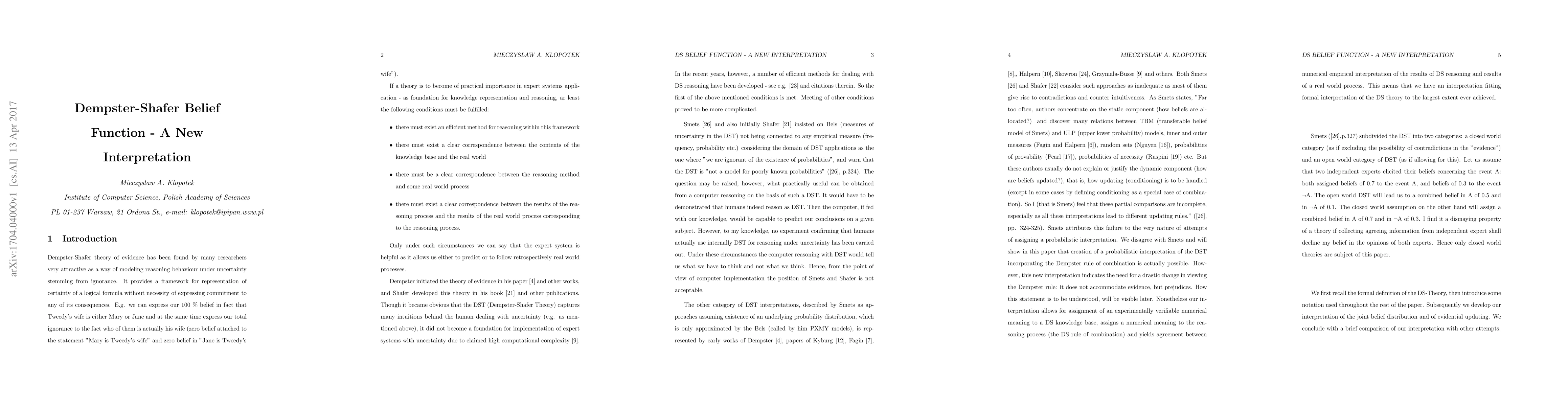 We develop our interpretation of the joint belief distribution and of evidential updating that matches the following basic requirements: * there must exist an efficient method for reasoning within this framework * there must exist a clear correspondence between the contents of the knowledge base and the real world * there must be a clear correspondence between the reasoning method and some real world process * there must exist a clear correspondence between the results of the reasoning process and the results of the real world process corresponding to the reasoning process.