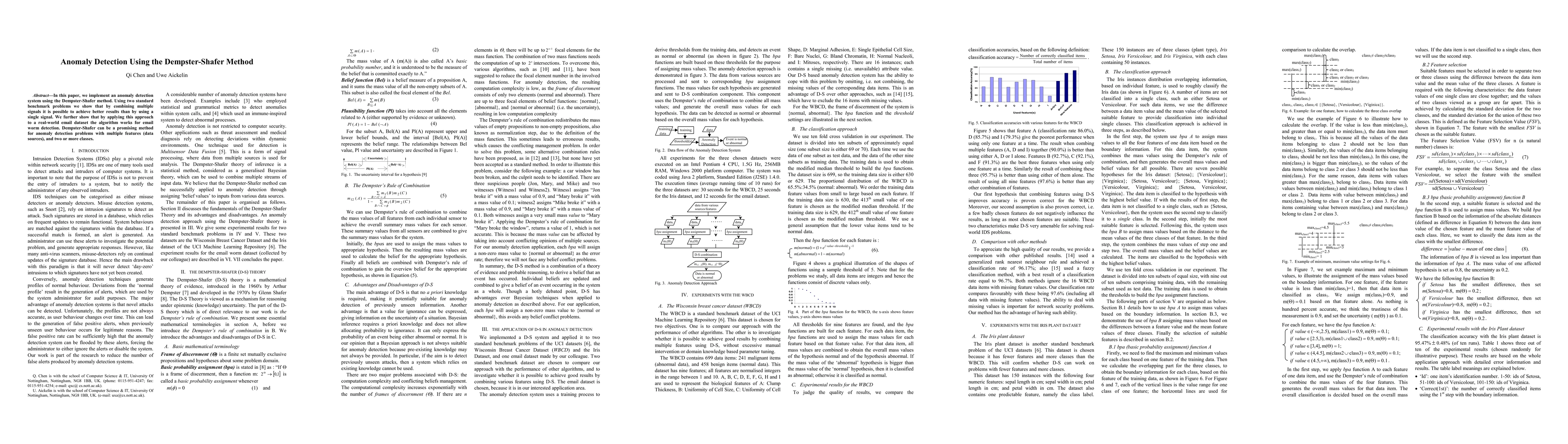 This paper implements an anomaly detection system using the Dempster-Shafer method, demonstrating improved results by combining multiple signals over single signals on benchmark problems and real-world email datasets for worm detection. The Dempster-Shafer approach shows promise for multi-feature anomaly detection with two or more classes.