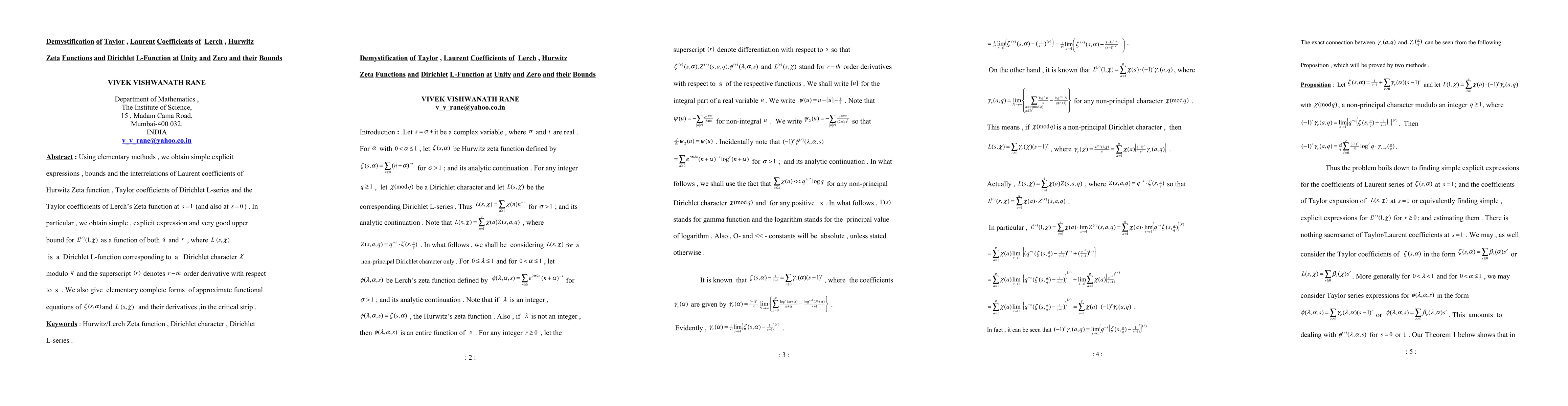 Using elementary methods,we obtain simple,explicit expressions and bounds of higher order derivatives of Hurwitz zeta function and consequently those of Dirichlet L-function and also,of Lerch's Zeta function at unity (and at Zero too)and also obtain their interrelations.We also state elementary complete forms of approximate functional equations of Hurwitz zeta function and Dirichlet L-function in the critical strip.