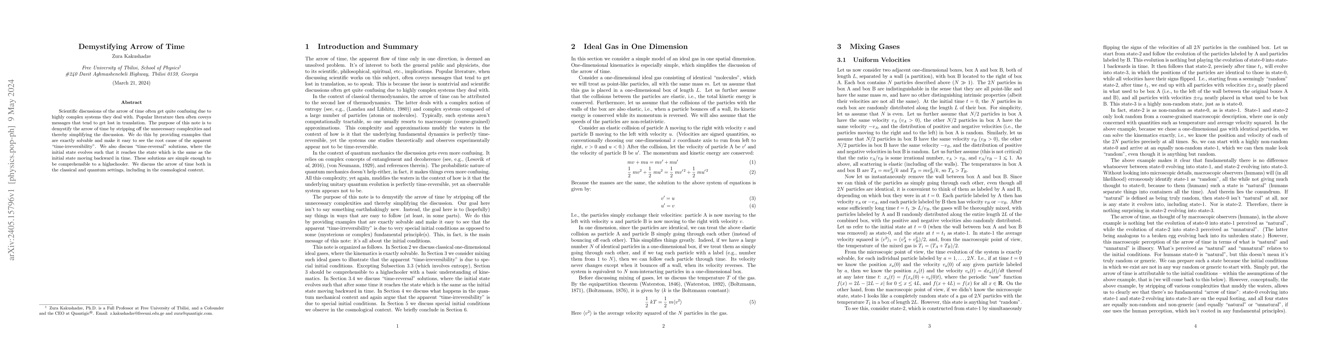 Scientific discussions of the arrow of time often get quite confusing due to highly complex systems they deal with. Popular literature then often coveys messages that tend to get lost in translation. The purpose of this note is to demystify the arrow of time by stripping off the unnecessary complexities and thereby simplifying the discussion. We do this by providing examples that are exactly solvable and make it easy to see the root cause of the apparent "time-irreversibility". We also discuss "time-reversal" solutions, where the initial state evolves such that it reaches the state which is the same as the initial state moving backward in time. These solutions are simple enough to be comprehensible to a highschooler. We discuss the arrow of time both in the classical and quantum settings, including in the cosmological context.