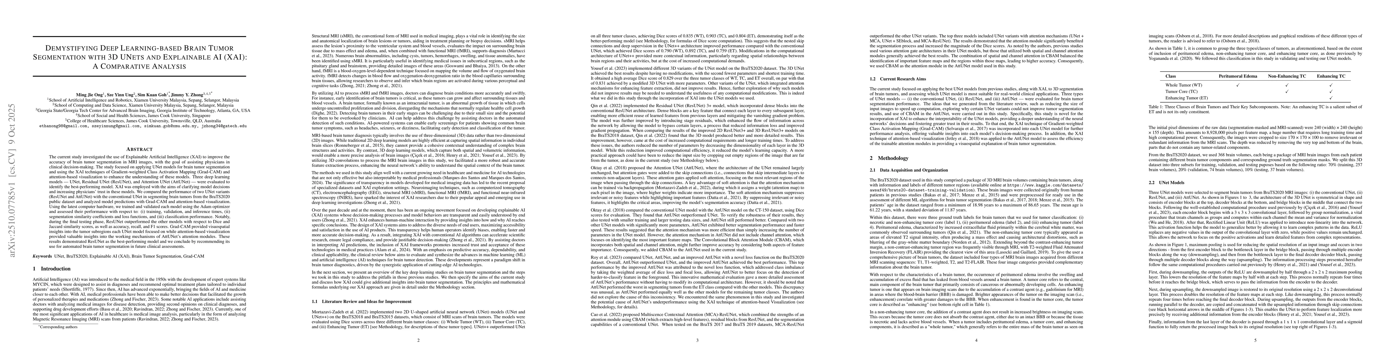 The study compared three UNet-based models (UNet, ResUNet, and AttUNet) for brain tumor segmentation using the BraTS2020 dataset. It evaluated performance through Dice scores, Jaccard similarity, training efficiency, and classification metrics. The models were analyzed using XAI techniques like Grad-CAM and attention-based visualization to enhance interpretability.