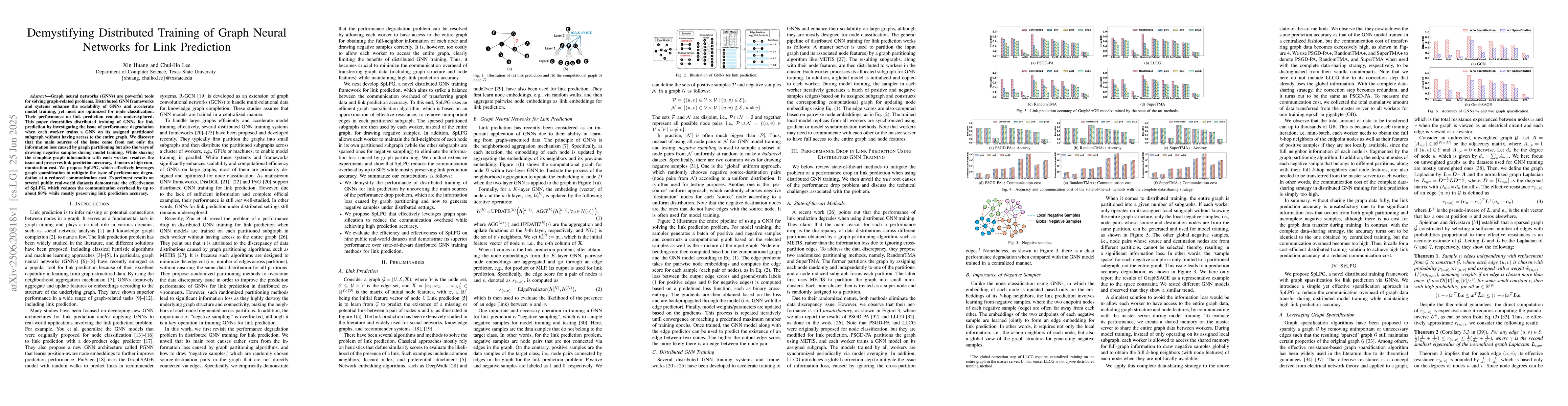 Graph neural networks (GNNs) are powerful tools for solving graph-related problems. Distributed GNN frameworks and systems enhance the scalability of GNNs and accelerate model training, yet most are optimized for node classification. Their performance on link prediction remains underexplored. This paper demystifies distributed training of GNNs for link prediction by investigating the issue of performance degradation when each worker trains a GNN on its assigned partitioned subgraph without having access to the entire graph. We discover that the main sources of the issue come from not only the information loss caused by graph partitioning but also the ways of drawing negative samples during model training. While sharing the complete graph information with each worker resolves the issue and preserves link prediction accuracy, it incurs a high communication cost. We propose SpLPG, which effectively leverages graph sparsification to mitigate the issue of performance degradation at a reduced communication cost. Experiment results on several public real-world datasets demonstrate the effectiveness of SpLPG, which reduces the communication overhead by up to about 80% while mostly preserving link prediction accuracy.