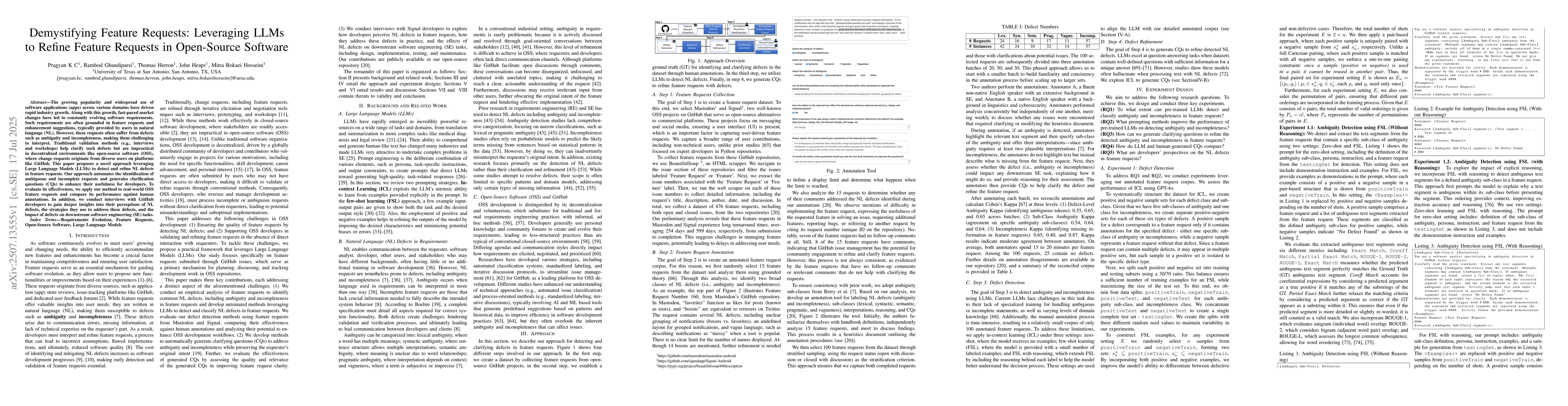 The growing popularity and widespread use of software applications (apps) across various domains have driven rapid industry growth. Along with this growth, fast-paced market changes have led to constantly evolving software requirements. Such requirements are often grounded in feature requests and enhancement suggestions, typically provided by users in natural language (NL). However, these requests often suffer from defects such as ambiguity and incompleteness, making them challenging to interpret. Traditional validation methods (e.g., interviews and workshops) help clarify such defects but are impractical in decentralized environments like open-source software (OSS), where change requests originate from diverse users on platforms like GitHub. This paper proposes a novel approach leveraging Large Language Models (LLMs) to detect and refine NL defects in feature requests. Our approach automates the identification of ambiguous and incomplete requests and generates clarification questions (CQs) to enhance their usefulness for developers. To evaluate its effectiveness, we apply our method to real-world OSS feature requests and compare its performance against human annotations. In addition, we conduct interviews with GitHub developers to gain deeper insights into their perceptions of NL defects, the strategies they use to address these defects, and the impact of defects on downstream software engineering (SE) tasks.