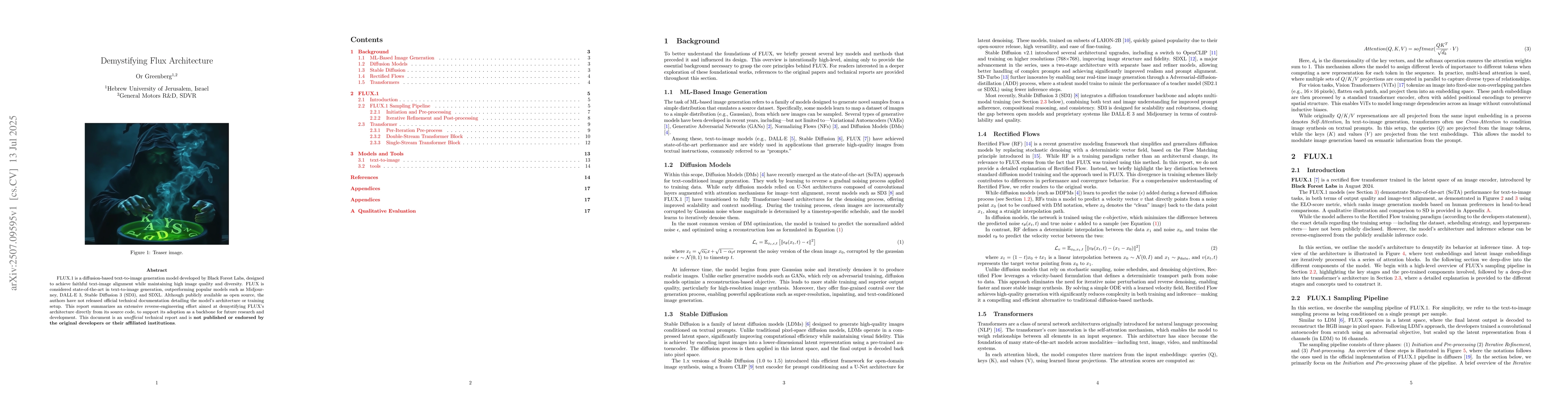 FLUX.1 is a diffusion-based text-to-image generation model developed by Black Forest Labs, designed to achieve faithful text-image alignment while maintaining high image quality and diversity. FLUX is considered state-of-the-art in text-to-image generation, outperforming popular models such as Midjourney, DALL-E 3, Stable Diffusion 3 (SD3), and SDXL. Although publicly available as open source, the authors have not released official technical documentation detailing the model's architecture or training setup. This report summarizes an extensive reverse-engineering effort aimed at demystifying FLUX's architecture directly from its source code, to support its adoption as a backbone for future research and development. This document is an unofficial technical report and is not published or endorsed by the original developers or their affiliated institutions.
