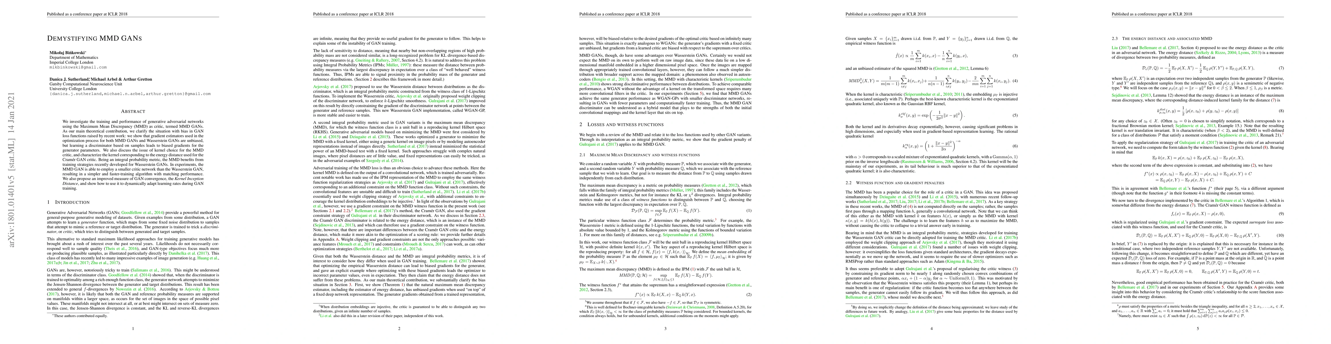 This paper explores the training and performance of MMD GANs, demonstrating that gradient estimators in MMD GANs and Wasserstein GANs are unbiased, but sample-based discriminator learning leads to biased generator gradients. It also introduces the Kernel Inception Distance for GAN convergence monitoring and shows MMD GANs can train faster with a smaller critic network while maintaining performance.