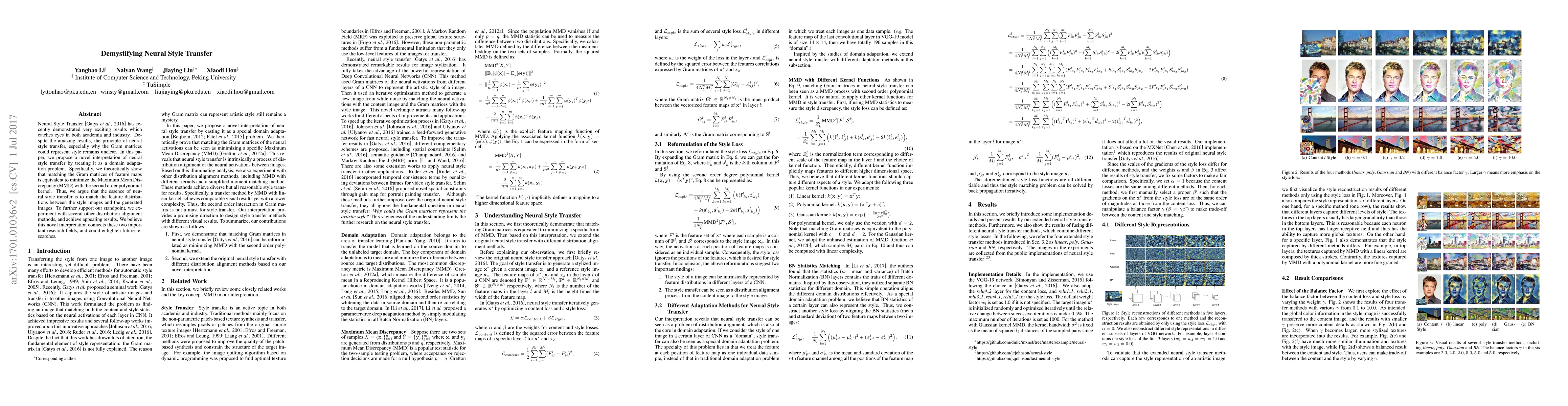Neural Style Transfer has recently demonstrated very exciting results which catches eyes in both academia and industry. Despite the amazing results, the principle of neural style transfer, especially why the Gram matrices could represent style remains unclear. In this paper, we propose a novel interpretation of neural style transfer by treating it as a domain adaptation problem. Specifically, we theoretically show that matching the Gram matrices of feature maps is equivalent to minimize the Maximum Mean Discrepancy (MMD) with the second order polynomial kernel. Thus, we argue that the essence of neural style transfer is to match the feature distributions between the style images and the generated images. To further support our standpoint, we experiment with several other distribution alignment methods, and achieve appealing results. We believe this novel interpretation connects these two important research fields, and could enlighten future researches.