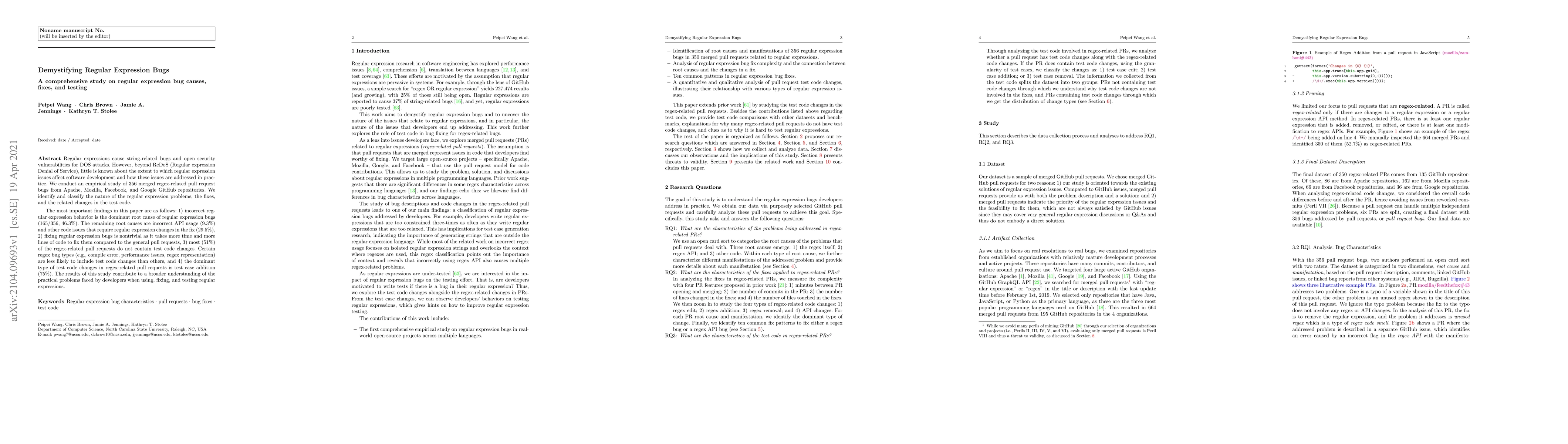 This study analyzes 356 regex-related bug fixes from major tech repositories, finding that incorrect regex behavior is the primary cause of these bugs. It reveals that fixing such bugs is complex and time-consuming, with most fixes not accompanied by test code changes.