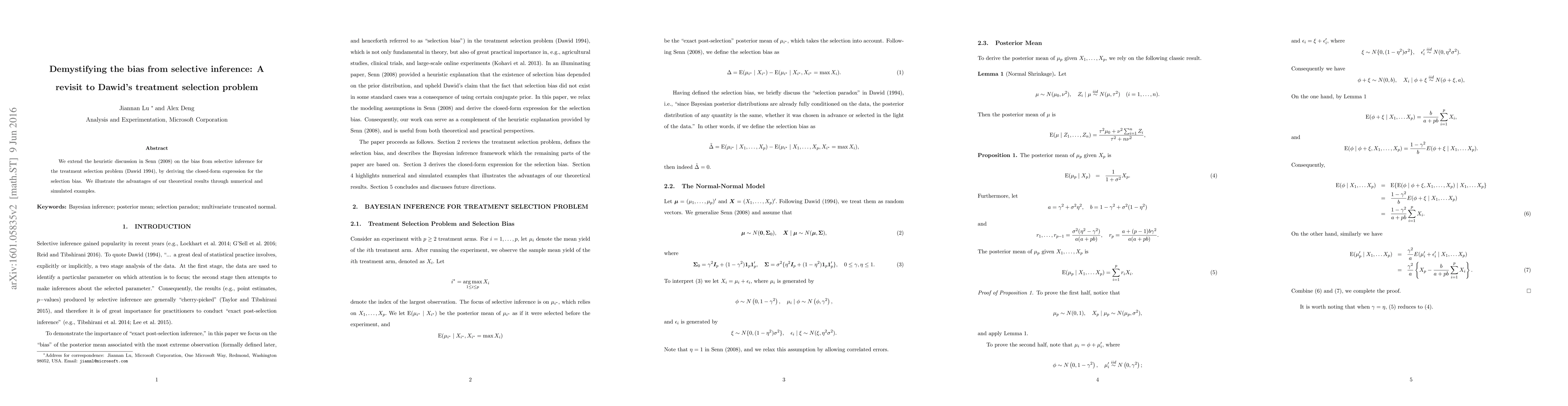 We extend the heuristic discussion in Senn (2008) on the bias from selective inference for the treatment selection problem (Dawid 1994), by deriving the closed-form expression for the selection bias. We illustrate the advantages of our theoretical results through numerical and simulated examples.