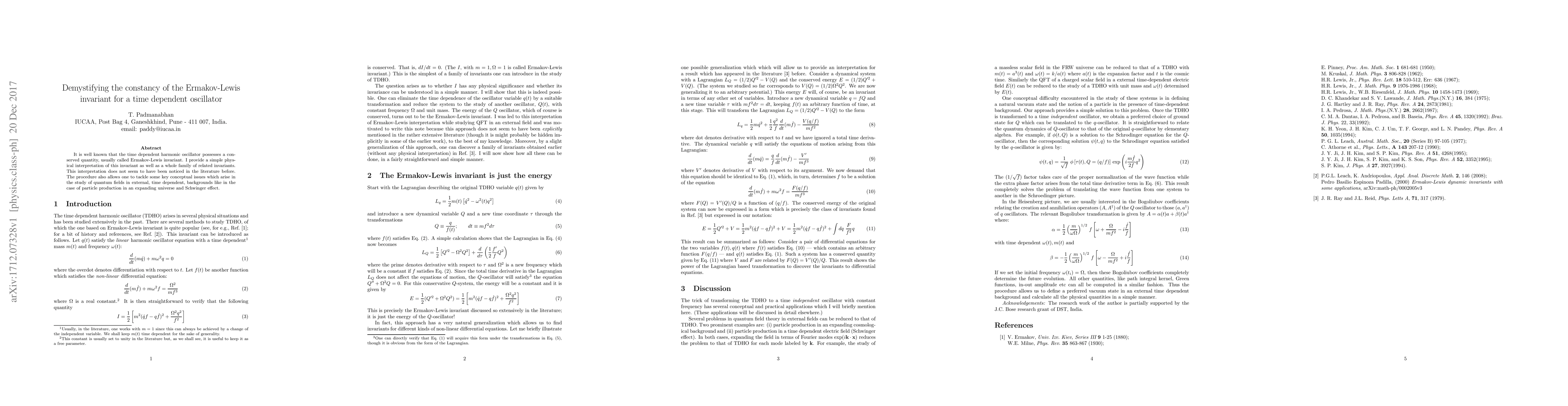 It is well known that the time dependent harmonic oscillator possesses a conserved quantity, usually called Ermakov-Lewis invariant. I provide a simple physical interpretation of this invariant as well as a whole family of related invariants. This interpretation does not seem to have been noticed in the literature before. The procedure also allows one to tackle some key conceptual issues which arise in the study of quantum fields in external, time dependent, backgrounds like in the case of particle production in an expanding universe and Schwinger effect.