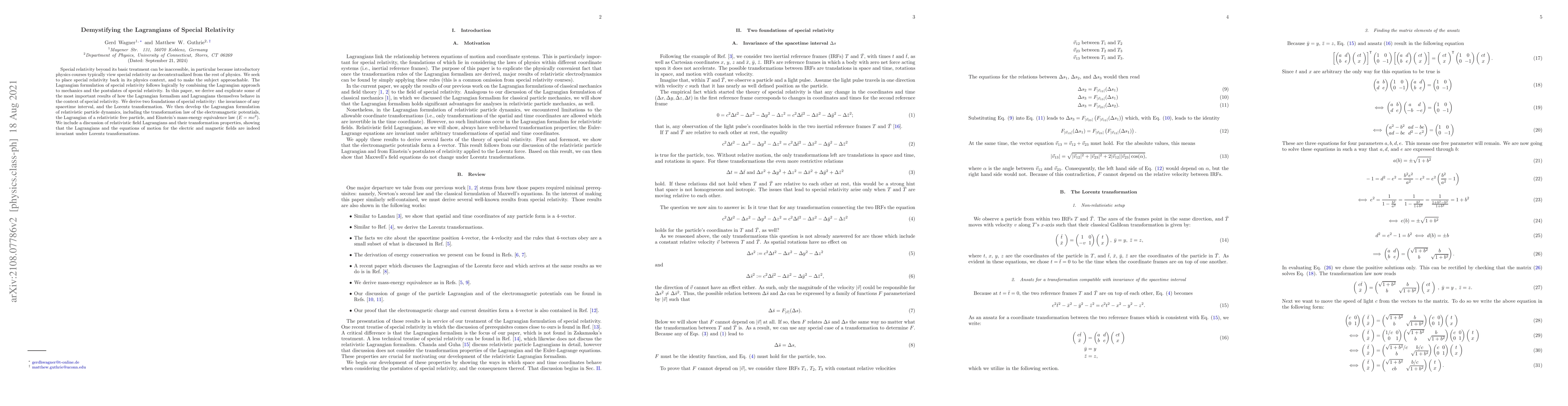 This paper derives the Lagrangian formulation of special relativity, linking it to mechanics and the postulates of special relativity. It explicates the invariance of spacetime intervals and the Lorentz transformations, and develops the Lagrangian dynamics of relativistic particles, including Einstein's mass-energy equivalence law.