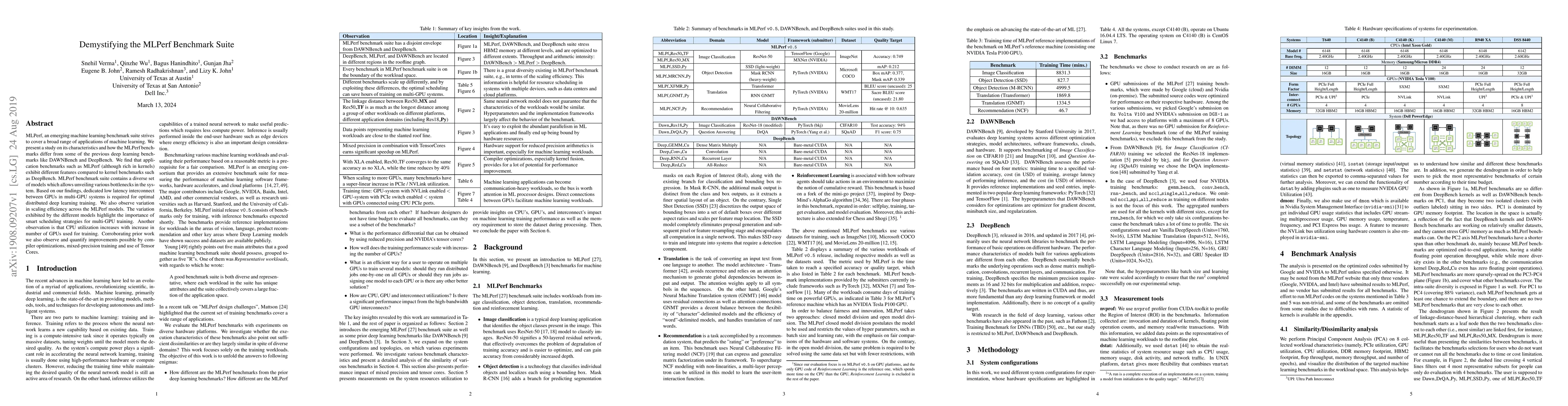 This study examines the MLPerf benchmark suite, highlighting its differences from previous deep learning benchmarks and emphasizing the necessity for dedicated interconnects and smart scheduling strategies for optimal multi-GPU training. It also notes the benefits of compiler optimizations, mixed-precision training, and Tensor Cores.