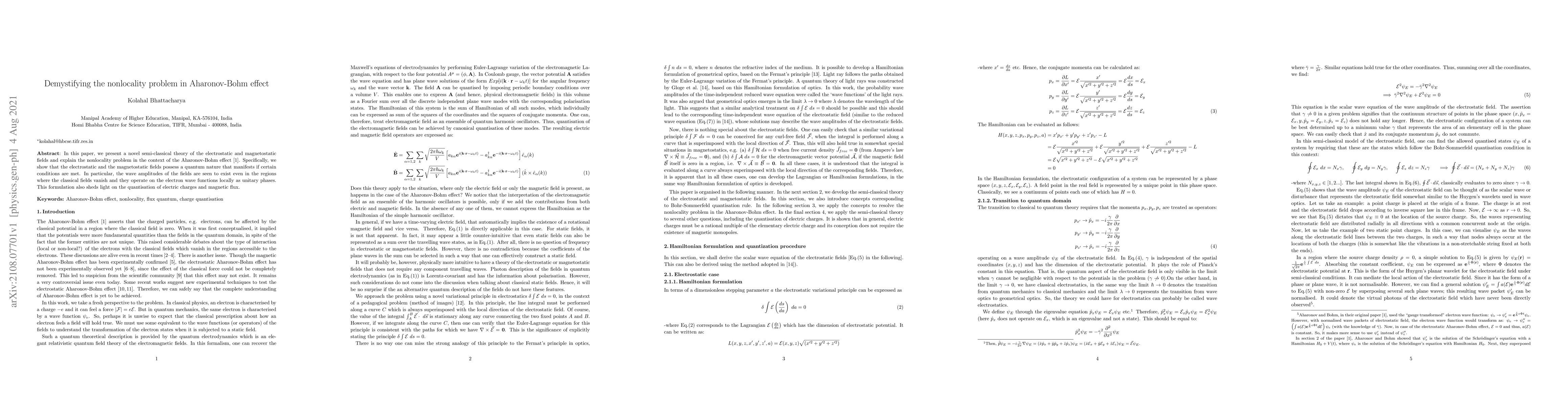 This paper introduces a novel semi-classical theory explaining the nonlocality in the Aharonov-Bohm effect, revealing the quantum nature of electrostatic and magnetostatic fields that operate as unitary phases even where classical fields vanish, thus elucidating the quantization of electric charges and magnetic flux.